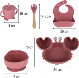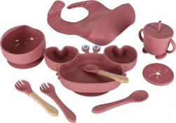 Dieses 9-teilige Set in elegantem Dunkelrosa enthält alles, was Sie für sicheres und komfortables Füttern ab 6 Monaten benötigen. Der geteilte Krabben-Teller und die Schüssel mit effektiven Saugnäpfen haften fest am Tisch oder am Hochstuhl, wodurch Verschütten und Unordnung minimiert werden. Weiches, BPA-freies, lebensmittelechtes Silikon ist sanft zu Zahnfleisch und Zähnchen und zugleich leicht zu reinigen.