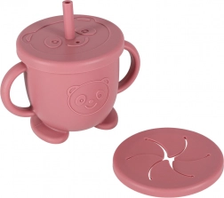 Vielseitiger Becher mit zwei Deckeln und Strohhalm – nutzbar als auslaufsichere Snackdose und als Becher mit Strohhalm. Ergonomische Griffe für leichtes Halten.