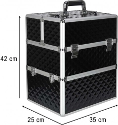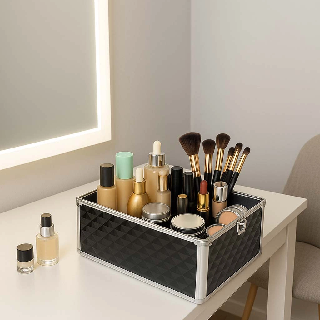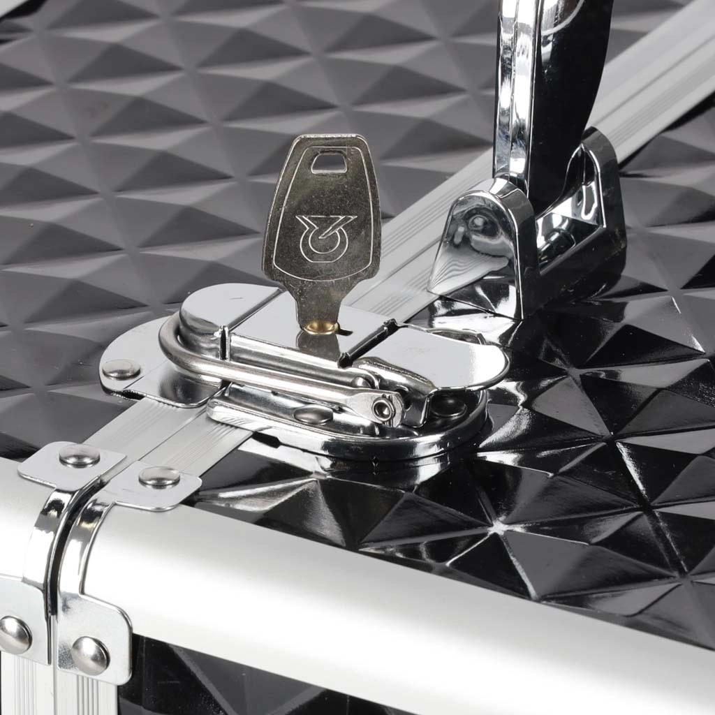Der Koffer ist abschließbar (inklusive 2 Schlüssel), sodass Ihre Kosmetik und Werkzeuge sicher bleiben. Dank ergonomischem Griff und kompakten Abmessungen lässt er sich leicht ins Auto, ins Studio oder zu Auftritten mitnehmen.