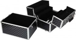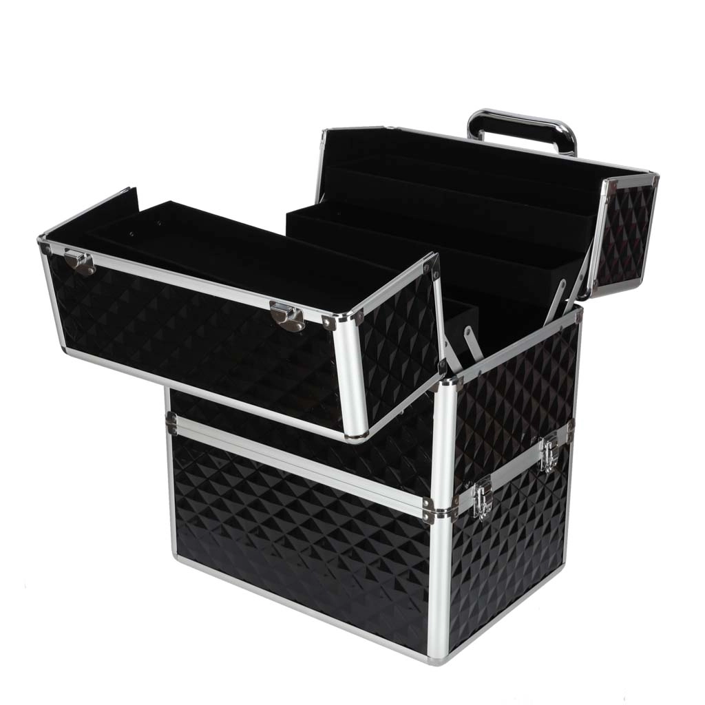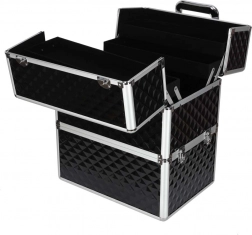 Dieser große Kosmetikkoffer im Stil einer Friseur-Train-Case bietet eine clevere Raumaufteilung: Beim Öffnen des Deckels fahren vier übersichtliche Fächer aus, und im unteren Teil befindet sich ein tiefes Hauptfach für größere Produkte, Fläschchen und Tools. Die strapazierfähige Ausführung mit Aluminiumkanten und verstärkten Ecken schützt den Inhalt auf Reisen und im täglichen Gebrauch.