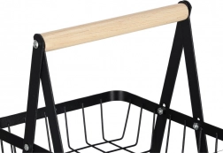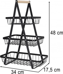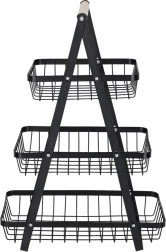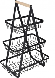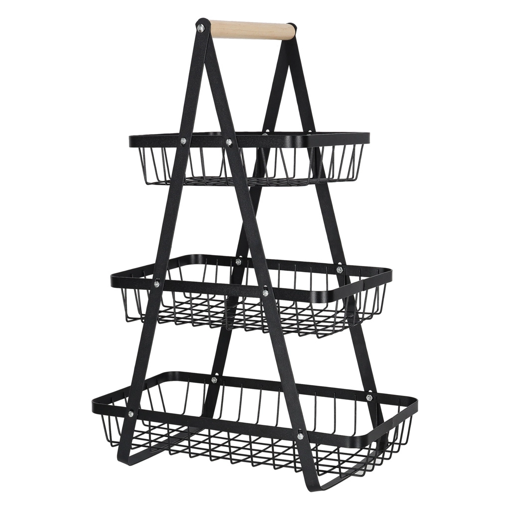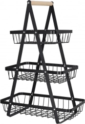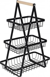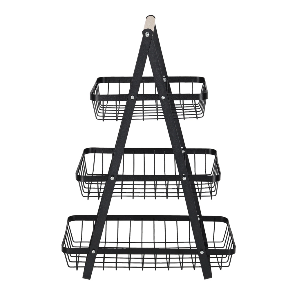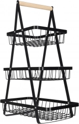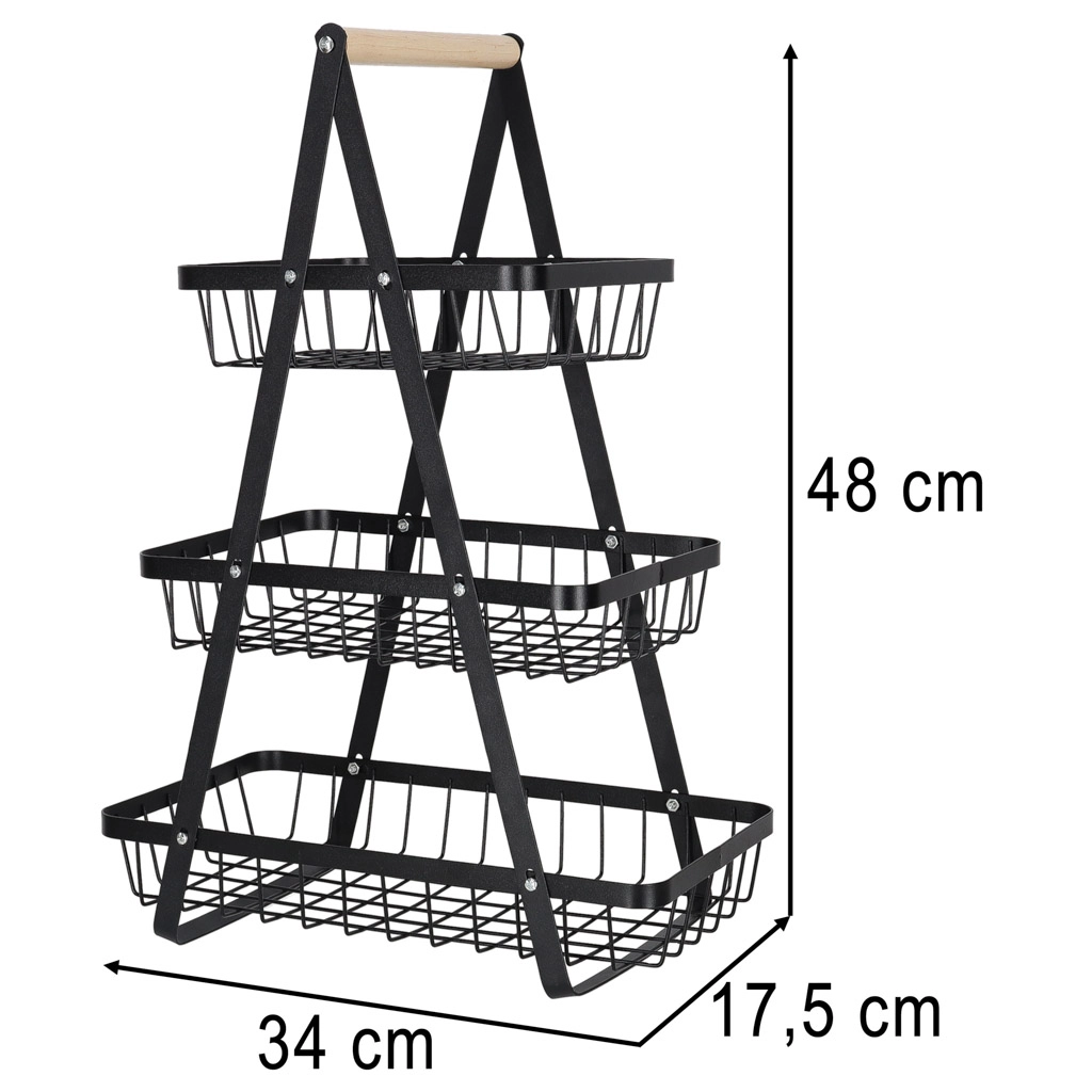 Organisieren Sie Küche, Vorratsraum oder Essbereich mit dem eleganten dreistöckigen Ständer. Die robuste Metallkonstruktion in matt Schwarz und der bequeme Holzgriff sorgen für Stabilität, Langlebigkeit und einfaches Transportieren. Dank der gestuften Anordnung haben Sie den Inhalt stets im Blick und griffbereit.