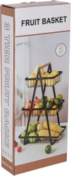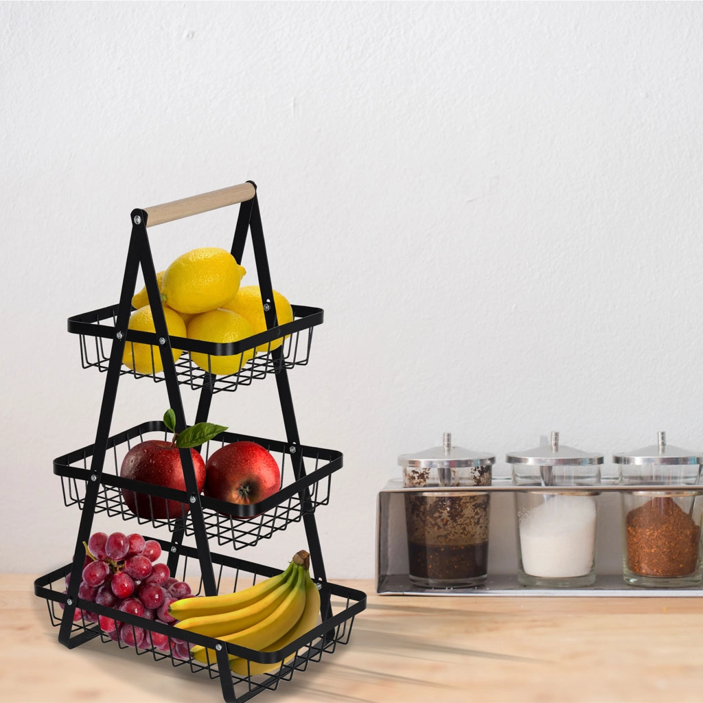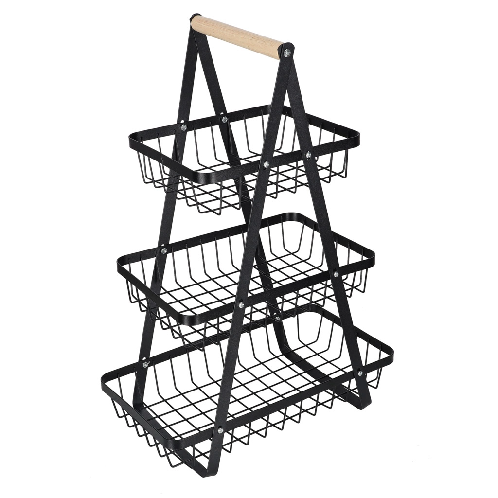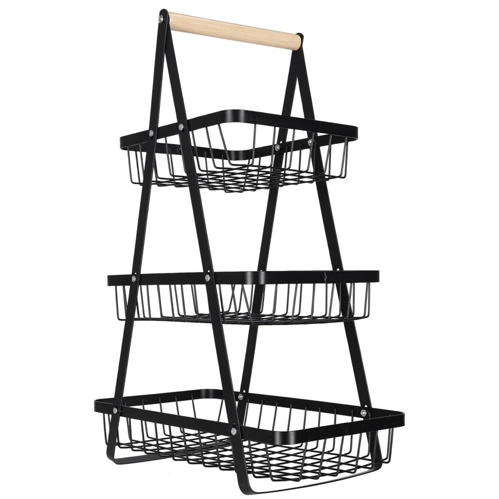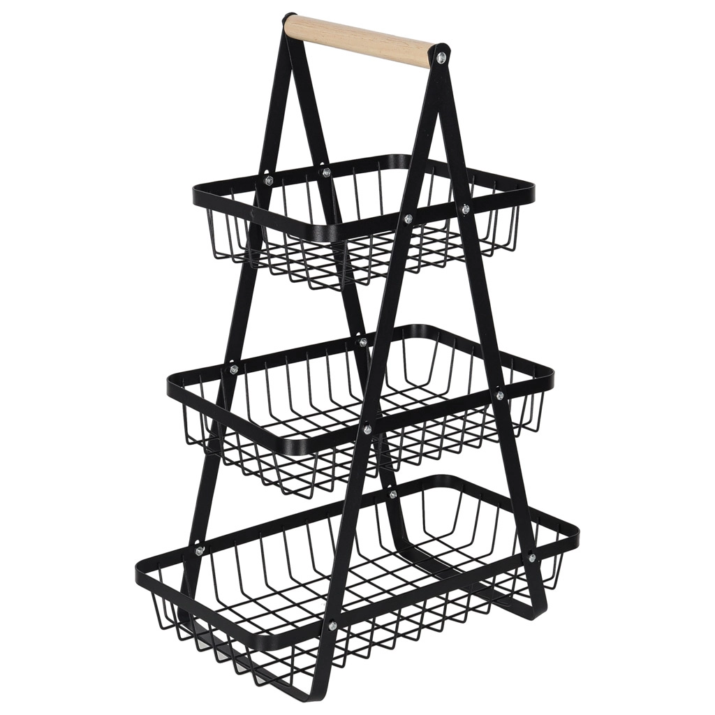 Dreistöckiger Metall-Obstkorb mit Holzgriff, schwarz