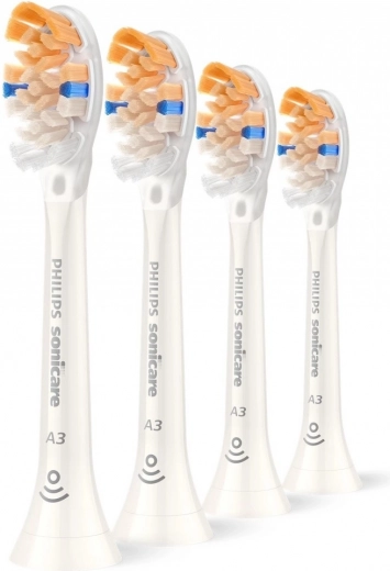 Die Ersatzbürstenköpfe PHILIPS Sonicare A3 All‑in‑One sind für maximale Effizienz und Komfort konzipiert. Speziell geformte Borstenbündel mit dreieckigem Profil erhöhen den Kontakt zur Zahnoberfläche für eine schnelle Entfernung von Verfärbungen, während längere Seitenborsten den Zahnfleischsaum pflegen. Die Schalltechnologie überträgt die Reinigungswirkung auch in die Zahnzwischenräume und entlang des Zahnfleischrands.