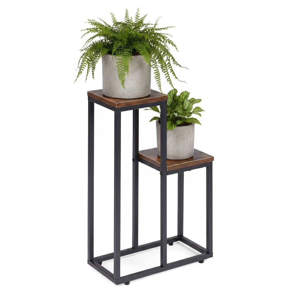 Eleganter Pflanzenständer im industriellen Loft-Stil von ModernHome, ideal für Wohnzimmer, Büro und gewerbliche Räume. Er bietet 2 praktische Ablagen aus Spanplatte, eine stabile Stahlkonstruktion mit Pulverbeschichtung und rutschfeste Füße zum Schutz des Bodens. Dank der kompakten Maße schaffen Sie auch in kleineren Interieurs eine beeindruckende Pflanzenausstellung.