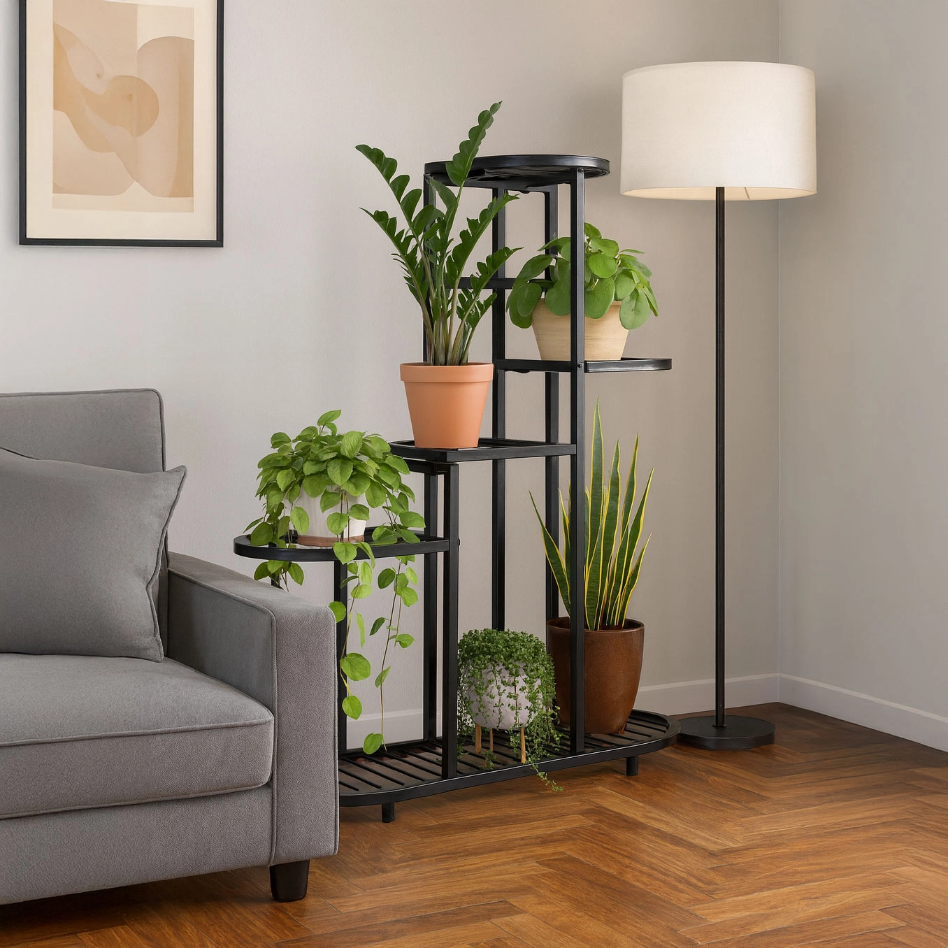Pulverbeschichteter Stahl gewährleistet Korrosionsbeständigkeit und Langlebigkeit, während rutschfeste Kappen den Boden vor Kratzern schützen und die Stabilität auf glatten Oberflächen erhöhen. Durch die stufenförmigen Ablagen erhalten die Pflanzen mehr Licht und eine bessere Luftzirkulation.
