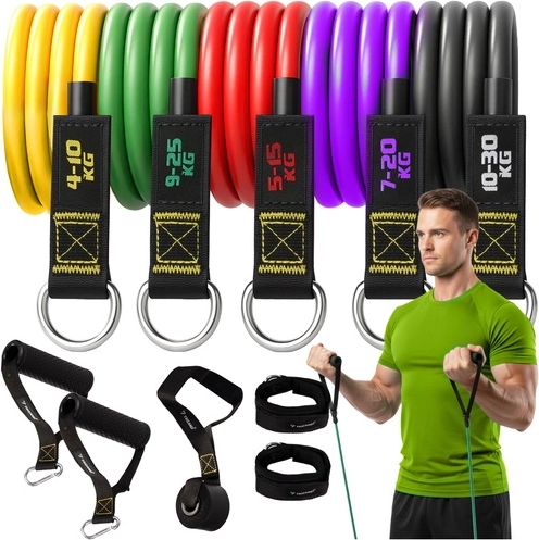 Widerstandsfähige Materialien (Latexbänder, strapazierfähiges Gewebe und Metallkomponenten) sorgen für Stabilität, Elastizität und lange Lebensdauer. Rutschfeste Griffe bieten sicheren Halt auch bei intensiven Sätzen. Für leichten Transport sorgt das praktische Etui, und die Geschenkverpackung erfreut jeden Fitness-Fan.