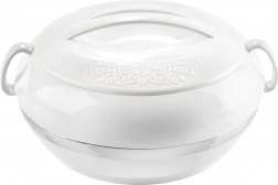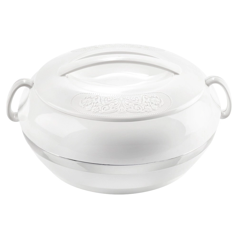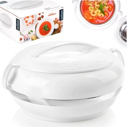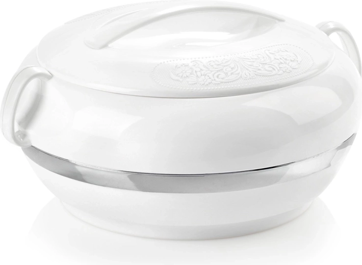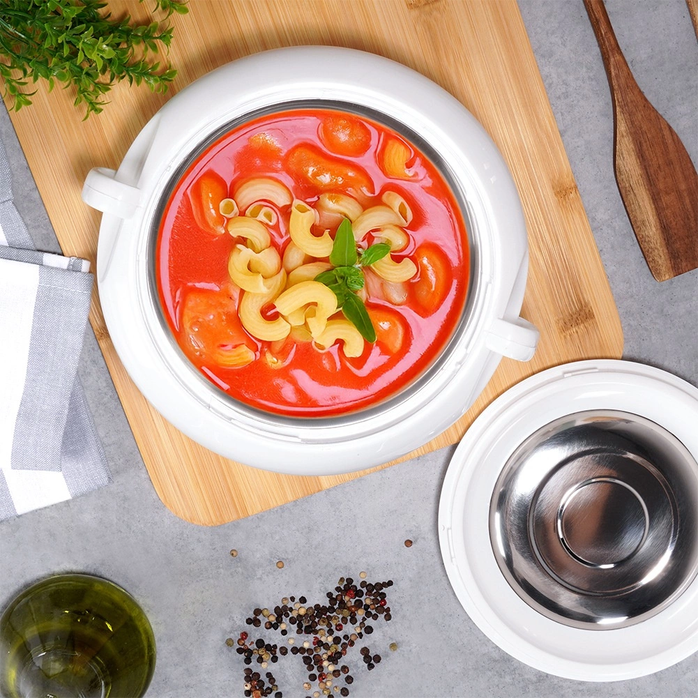 Halten Sie die Speisentemperatur ohne aufwendiges Aufwärmen. Diese isolierte Servierschüssel eignet sich perfekt für Familienessen, Grillabende und Gartenpartys. Der innere Edelstahlteil hilft, Wärme bis zu 2 Stunden zu bewahren, und im Sommer schützt er Eis oder kalte Desserts vor schnellem Schmelzen. Der elegante Deckel mit Dekor und das klare weiße Design passen in jede Küche.