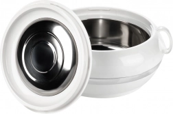 Die Handhabung ist dank drehbarem Verschluss und integrierten Griffen einfach. Die glatte Oberfläche lässt sich gut reinigen; durch Vorkühlen im Kühlschrank oder Vorwärmen mit heißem Wasser kann die Schüssel auf die ideale Temperatur vorbereitet werden. Beim Transport flüssiger Speisen bitte aufrecht halten.
