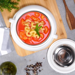 Doppelwandige Konstruktion mit Edelstahleinsatz hält Speisen länger warm oder kalt – ideal zum Servieren von Suppen und Desserts.