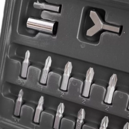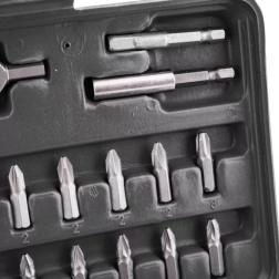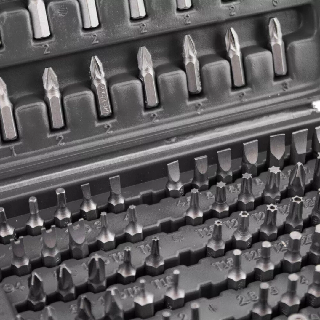 Dieses umfassende Set bietet eine breite Palette an Einsätzen – Schlitz, Kreuz PH und PZ, TORX sowie TORX mit Loch, metrische und zöllige Inbus-Bits, Sicherheitsbits wie Tri‑Wing, Spanner, Robertson (SQ), XZN und weitere. Widerstandsfähiger Stahl gewährleistet lange Lebensdauer und Zuverlässigkeit bei Montage, Service und Reparaturen.