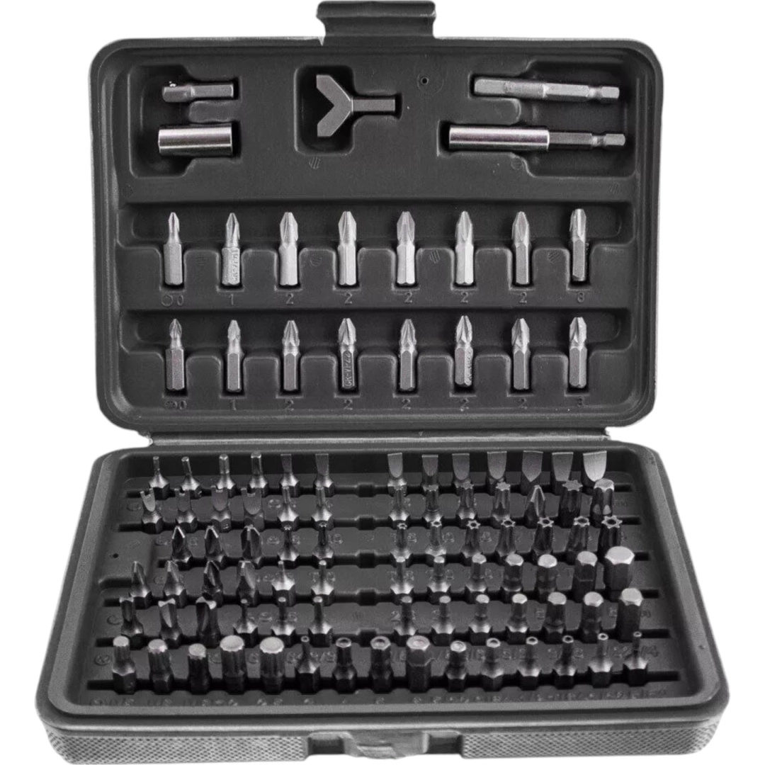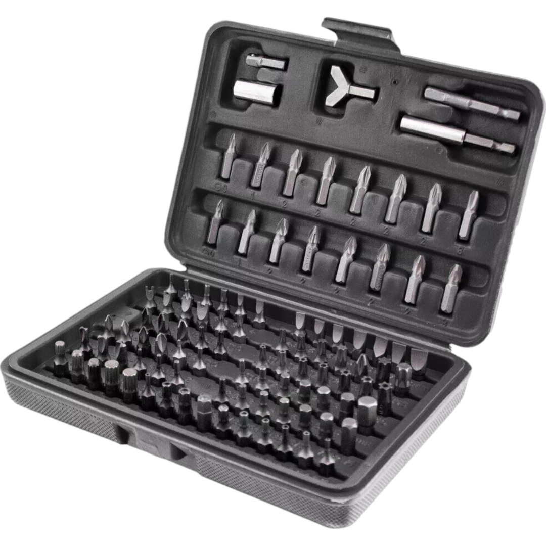 Universeller 100-teiliger Bitsatz für Heimwerker und Profis. Enthält gängige und spezielle Bits aus hochwertigem Stahl in einem robusten Organizer für übersichtliche Aufbewahrung und einfachen Transport.