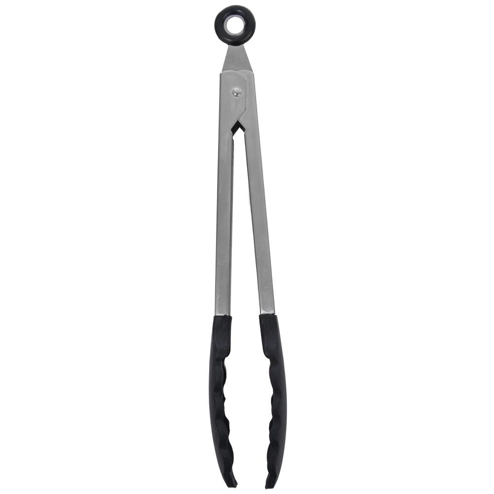 Praktische Küchenzange mit 35 cm Länge, die robusten Edelstahl und hitzebeständiges Silikon kombiniert, schonend für antihaftbeschichtete Oberflächen. Ideal zum Wenden, Servieren und Grillen, mit Sicherheitsverschluss zur platzsparenden Aufbewahrung und praktischem Aufhängeöse.