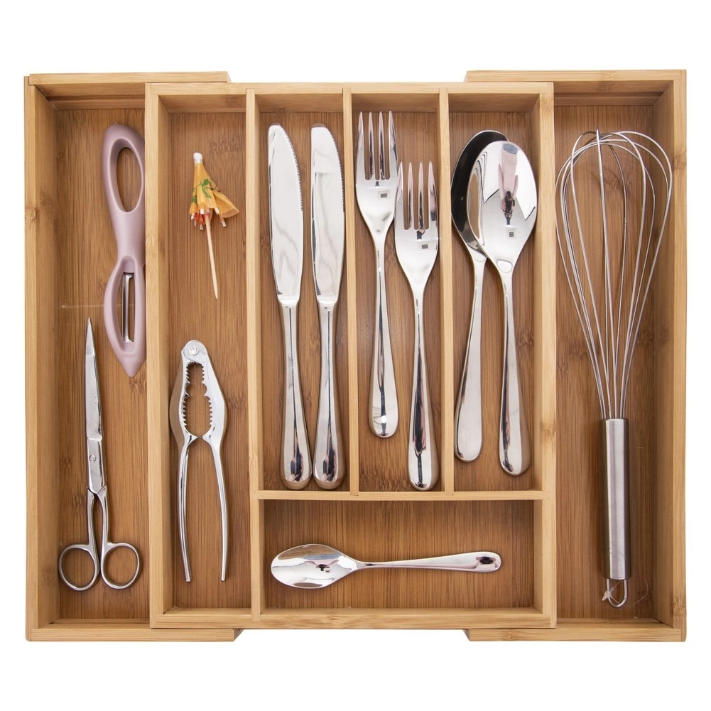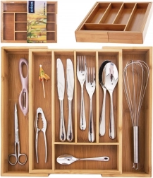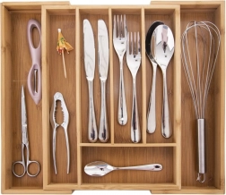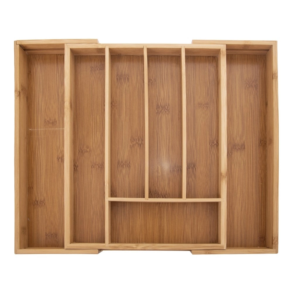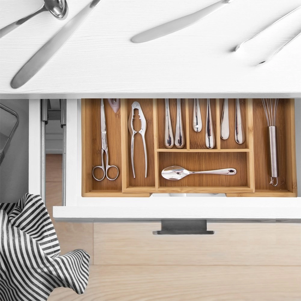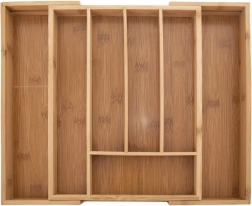 Das Bambusholz ist feuchtigkeits- und verformungsbeständig, nimmt keine Gerüche auf und lässt sich leicht reinigen. Der Organizer bietet 5 bis 7 Fächer je nach gewählter Erweiterung, sodass Sie das Innenlayout Ihren Bedürfnissen anpassen können – von Gabeln und Löffeln bis zu Schälern, Schneebesen oder Küchenscheren.