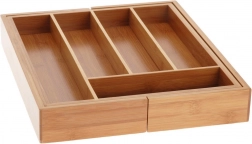 Der praktische Schubladeneinsatz aus natürlichem Bambus hilft Ihnen, Besteck und kleines Küchenzubehör elegant zu sortieren. Dank der seitlich ausziehbaren Elemente nutzen Sie jeden Zentimeter Platz, und alles bleibt an seinem Platz – übersichtlich und stets zur Hand.