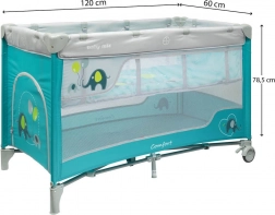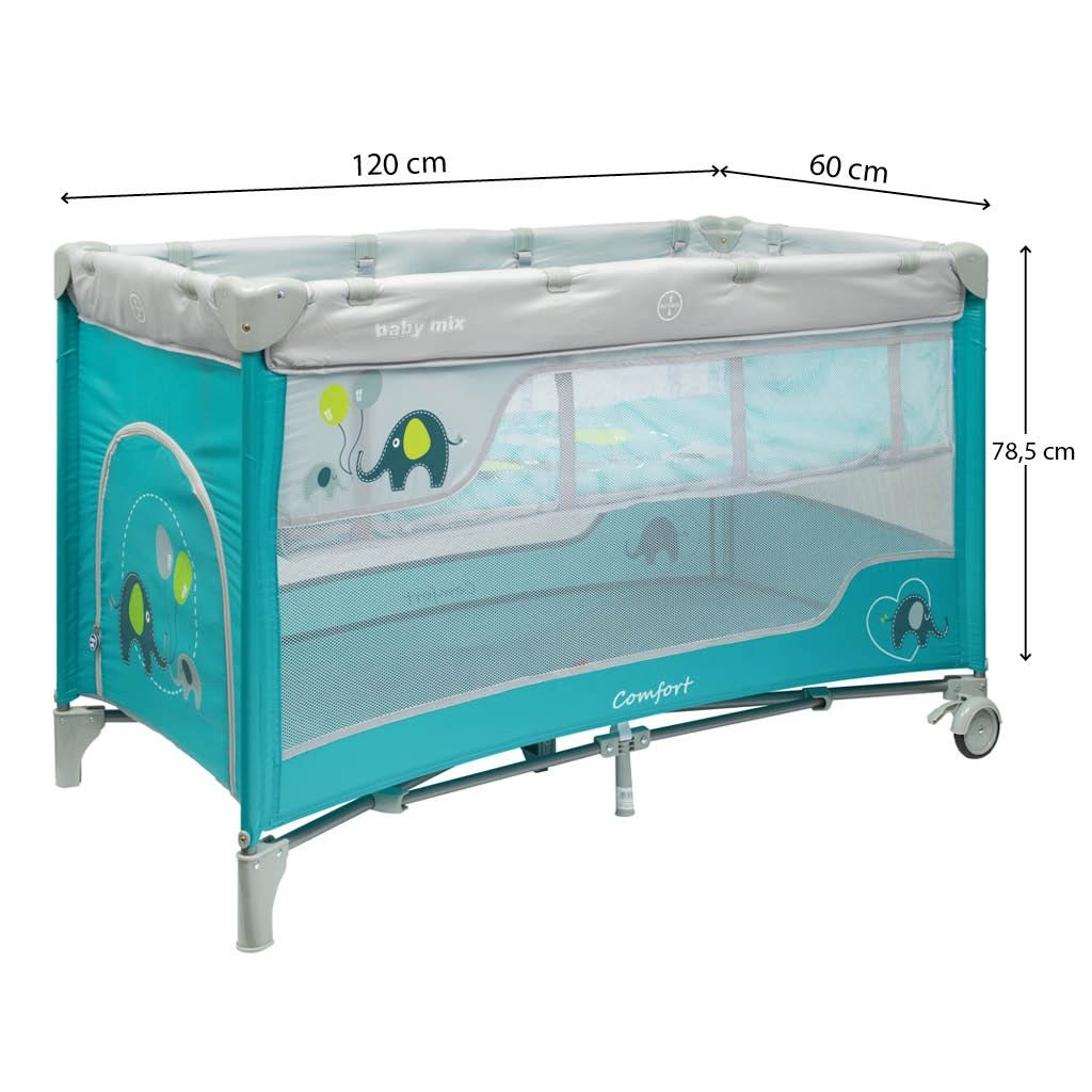 Praktisches und leichtes Reisebett BABY MIX mit Elefantenmotiv bietet zwei Liegehöhen, schnelles Zusammenklappen und seitliche Netzwände für optimale Luftzirkulation. Dank der Rollen mit Bremse lässt es sich leicht in der Wohnung oder auf die Terrasse verschieben. Inklusive Transporttasche und weicher, faltbarer Matratze 120 × 60 cm. Geeignet ab Geburt bis 15 kg, geprüft nach EN 716.