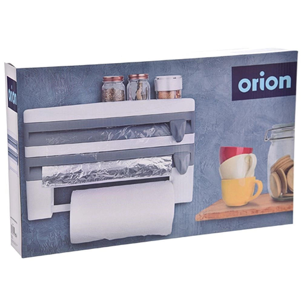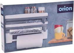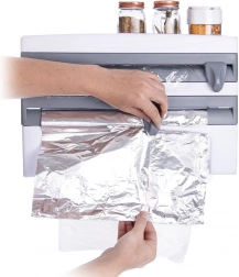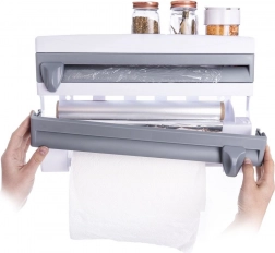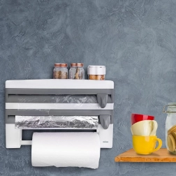 Praktischer 3-in-1-Wandorganizer für die Küche kombiniert einen Halter für Papierhandtücher und zwei Spender für Frischhalte- und Aluminiumfolie. Er bietet dank integrierter Klingen einen sauberen und schnellen Abriss, Platzersparnis und Ordnung auf der Arbeitsfläche. Das obere Ablagefach nimmt Gewürze oder kleine Küchenutensilien auf. Einfache Montage per Kleben oder Schrauben, Montagematerial ist enthalten.