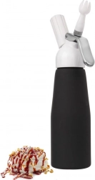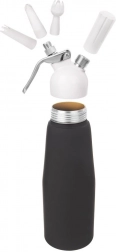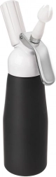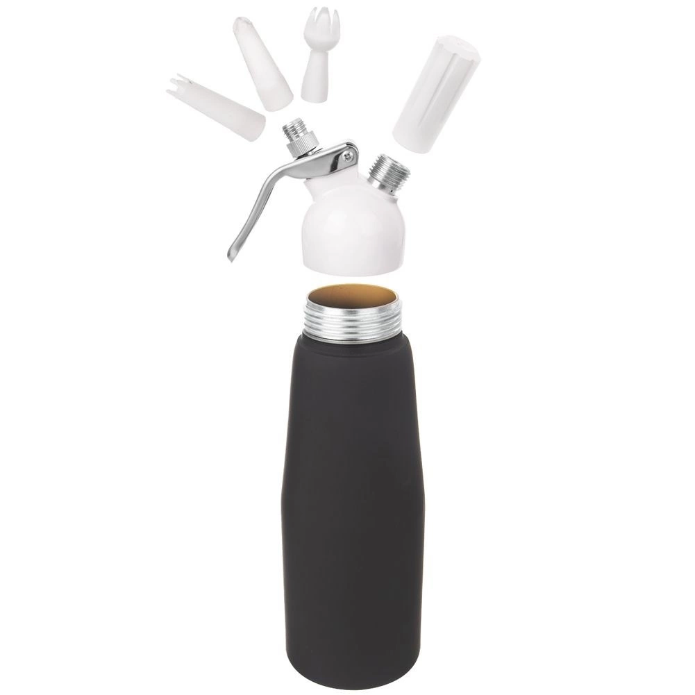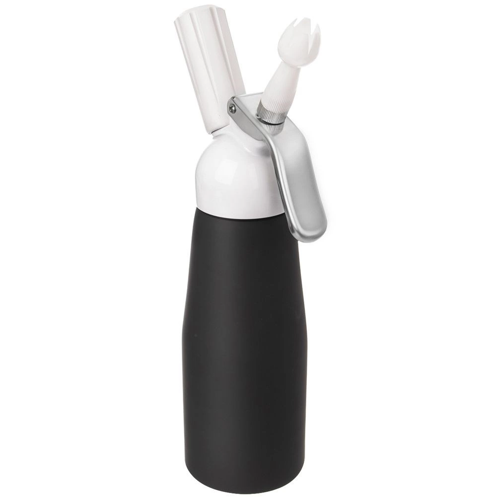 Bereiten Sie in wenigen Sekunden perfekt luftige Schlagsahne zu. Dieser Siphon mit 680 ml Volumen ermöglicht die Zubereitung von etwa 250–330 ml fertiger Schlagsahne auf einmal. Die Kombination aus schwarzem Aluminiumkörper und weißem Kopf mit Metallhebel gewährleistet Robustheit, sichere Anwendung und eine lange Lebensdauer. Drei austauschbare Düsen helfen Ihnen, elegante Dekorationen auf Desserts, Torten, Getränken und anderen Speisen zu kreieren.