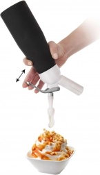 Die Bedienung ist einfach: Sahne eingießen, nach Wunsch aromatisieren (z. B. mit Vanillezucker oder Kakao), schließen, eine N2O-Kapsel einsetzen und schütteln. Die fertige Schlagsahne kann bis zu 24 Stunden im Kühlschrank aufbewahrt werden. Der Siphon ist leicht zerlegbar und einfach zu reinigen. Nicht für heiße Saucen geeignet. Zutaten, die Klumpen bilden (z. B. Sahnesteif, Gelatine oder Kristallzucker), werden nicht empfohlen.
