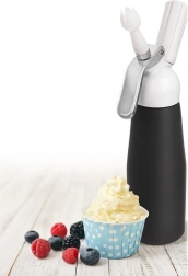 Einfach Sahne einfüllen, schließen, eine N2O-Kapsel aufschrauben und schütteln. Sie erhalten stabile, feine und formfeste Schlagsahne, bereit zum Dekorieren.
