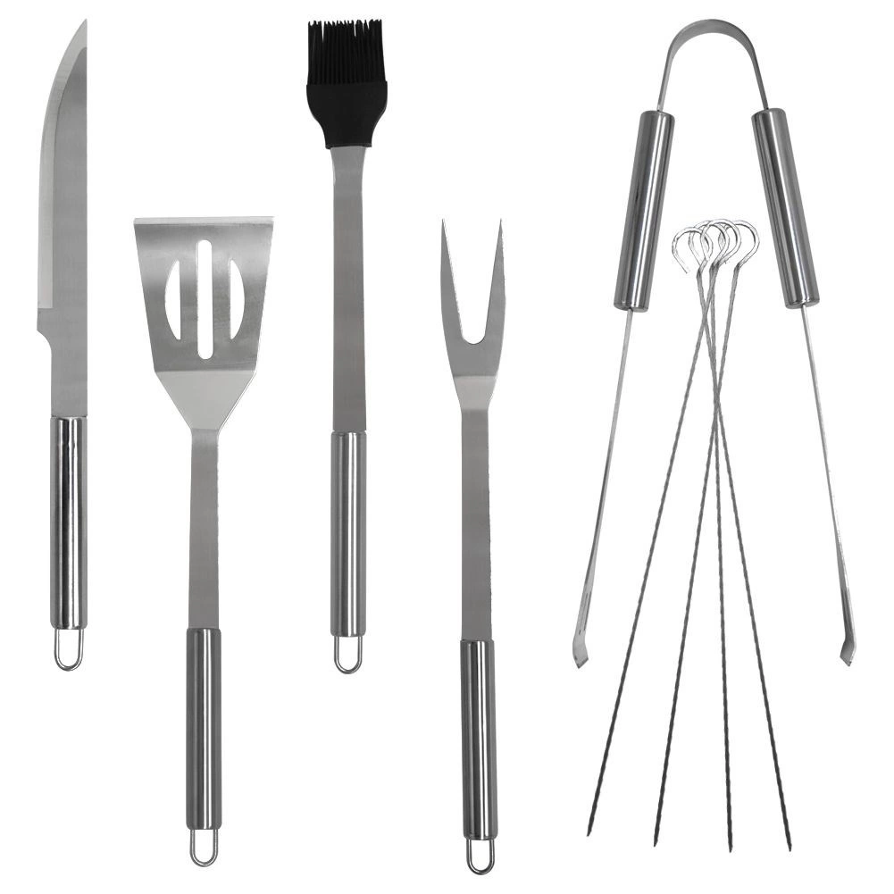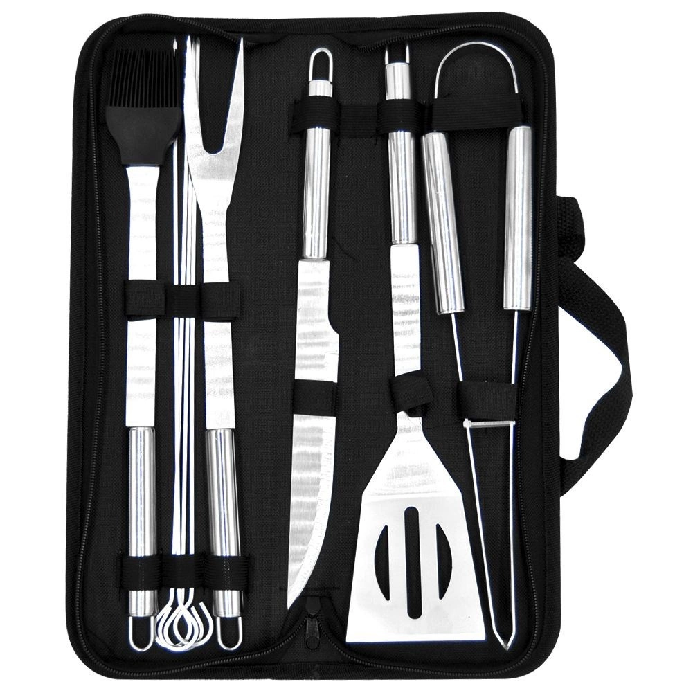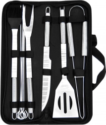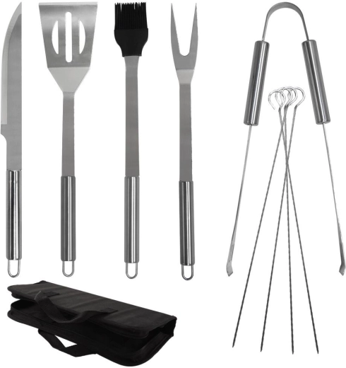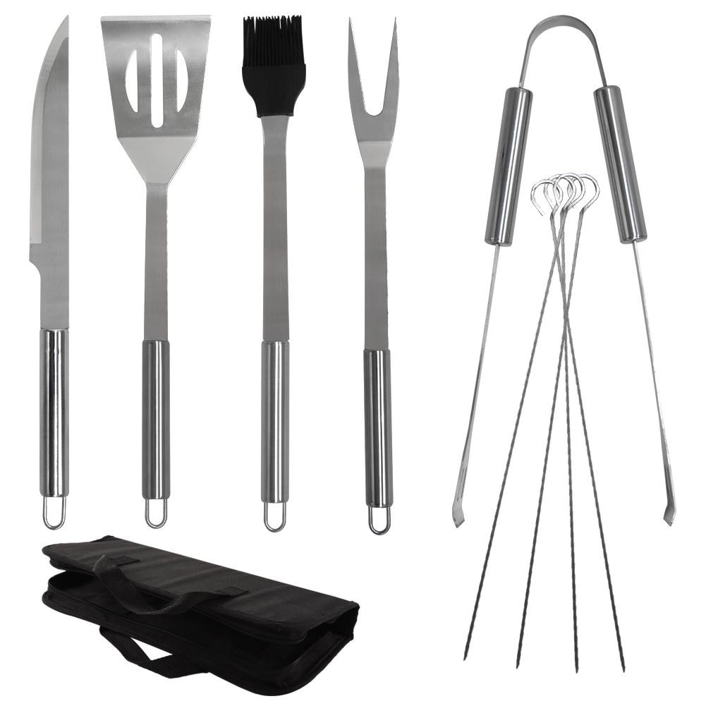 Dieses vielseitige 10-teilige Set deckt alle Bedürfnisse am Grill und in der Küche ab. Im Lieferumfang finden Sie einen Wender mit scharfer Kante für einfaches Schneiden direkt auf dem Rost, eine Fleischgabel, Zange, Messer, einen Marinierpinsel sowie 4 Spieße für Fleisch oder Gemüse. Alles ist in einem Textiletui mit Reißverschluss und Trageschlaufe übersichtlich verstaut und leicht zu transportieren.