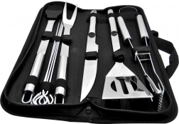 Komplettes Grillset aus hochwertigem Edelstahl in einer praktischen Tasche. Enthält alles für bequemes Wenden, Schneiden, Aufspießen und Servieren. Dank der langen Griffe ist die Handhabung am Grill sicher, das Besteck ist robust, leicht zu reinigen und spülmaschinengeeignet.