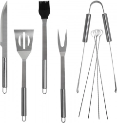 1× Wender, 1× Fleischgabel, 1× Zange, 1× Messer, 1× Marinierpinsel, 4× Spieß, 1× Etui