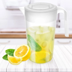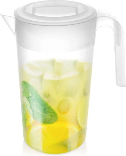 Universeller Krug aus robustem Kunststoff in klarer Ausführung – perfekt für Wasser, Säfte, hausgemachte Limonade, Eistee und Kompott. Dank ergonomischem Griff und präzise geformtem Ausgießer gelingt das Einschenken gleichmäßig und tropffrei, während der Deckel das Getränk vor Schmutz und Insekten schützt – zuhause wie im Garten.