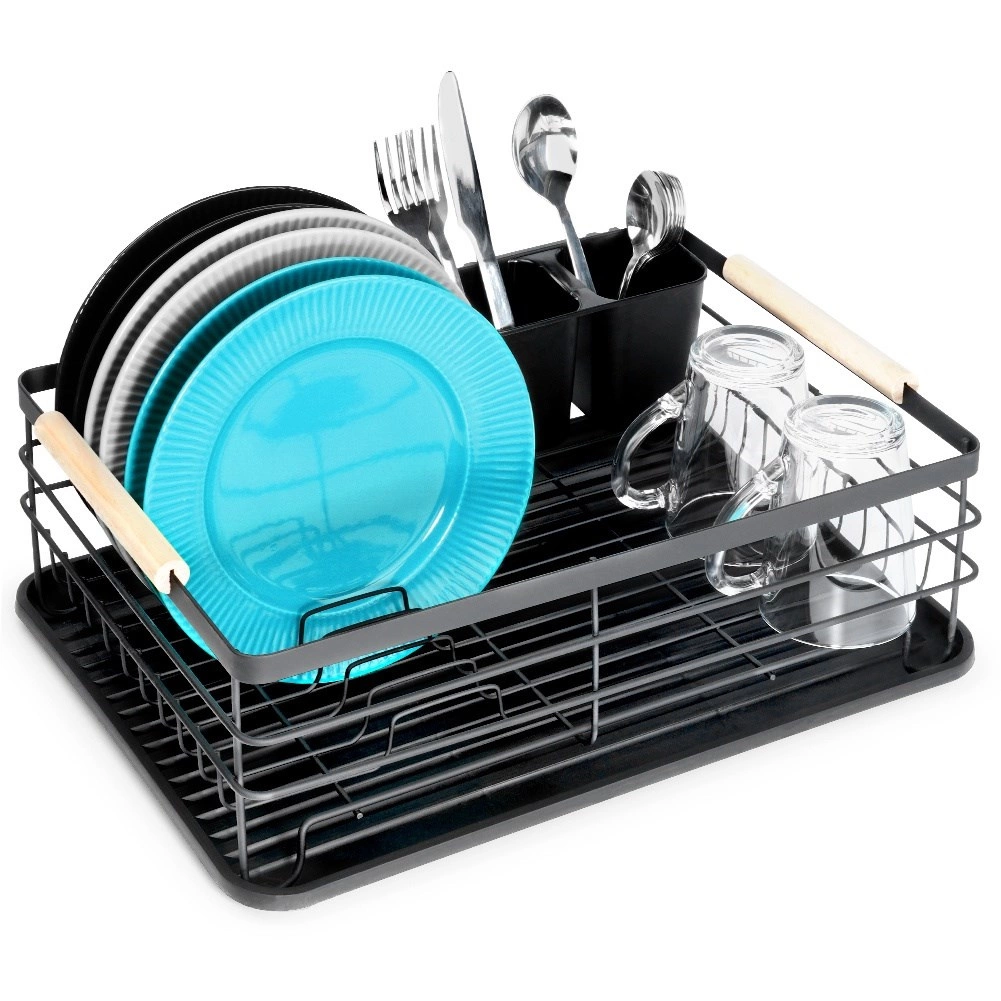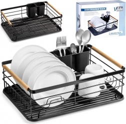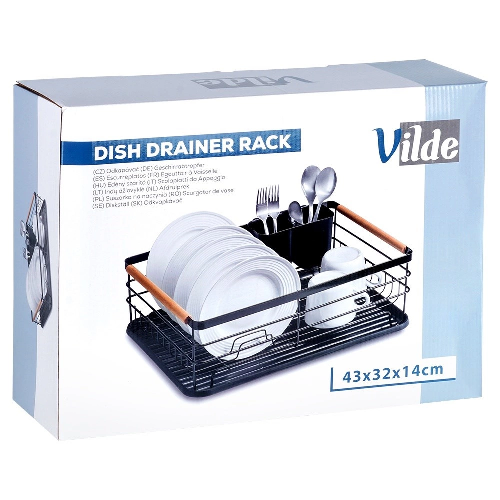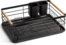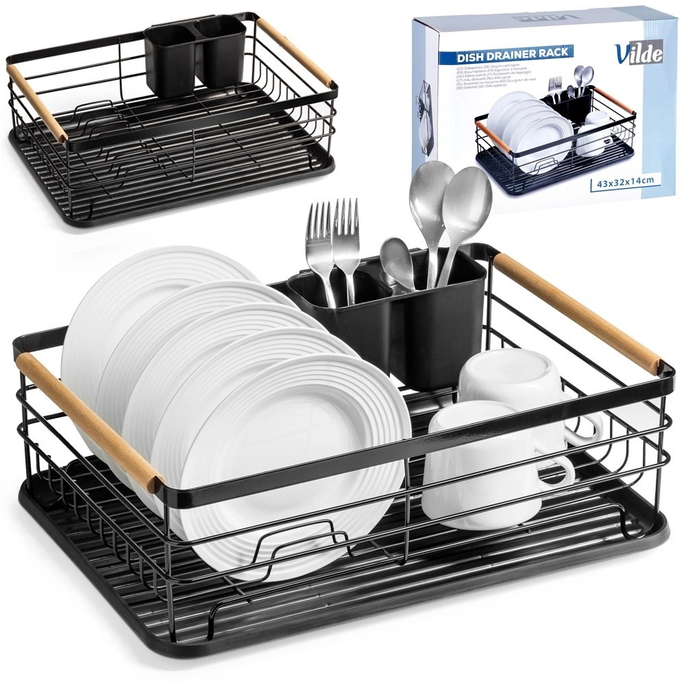 Praktisches Geschirr-Abtropfgestell in der Größe 43 × 32 × 14,5 cm erleichtert das Trocknen und Organisieren von Tellern, Gläsern und Besteck und schützt gleichzeitig die Küchenarbeitsplatte. Es besteht aus robustem Metall in schwarzer Farbe, verfügt über eine herausnehmbare Abtropfschale und einen zweiteiligen Besteckkorb. Dank der Kapazität für bis zu 10 Teller, der stabilen Drahtkonstruktion und den Griffen aus Bambusholz ist es sowohl zum Tragen als auch für den täglichen Gebrauch bequem. Das stilvolle industrielle Design passt hervorragend in moderne wie klassische Küchen.