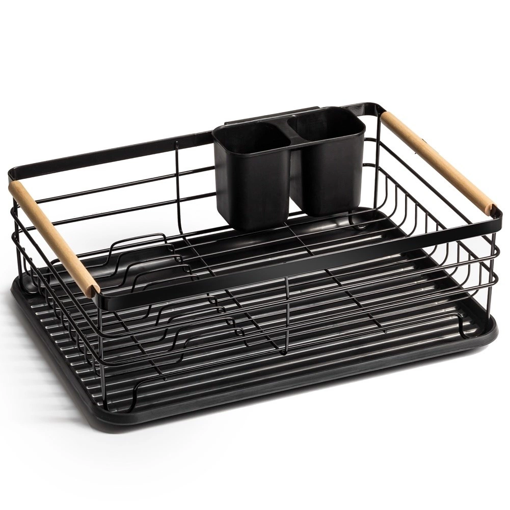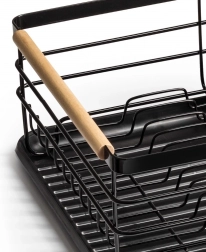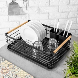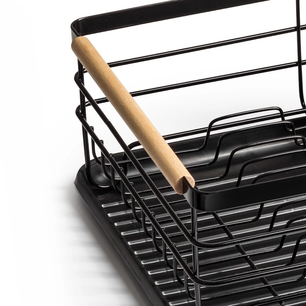 Elegantes und funktionales Geschirr-Abtropfgestell hilft, die Küche sauber und ordentlich zu halten. Die schwarze Metallausführung mit natürlichen Bambusgriffen verbindet Langlebigkeit mit modernem Look. Die herausnehmbare Abtropfschale fängt Wasser zuverlässig auf und erleichtert die Reinigung, während der zweiteilige Besteckkorb je nach Bedarf innen oder außen platziert werden kann.