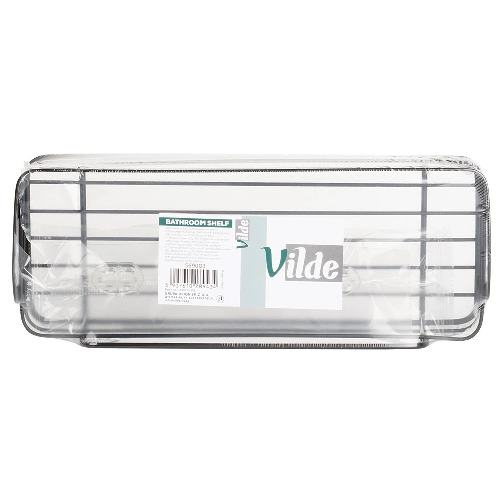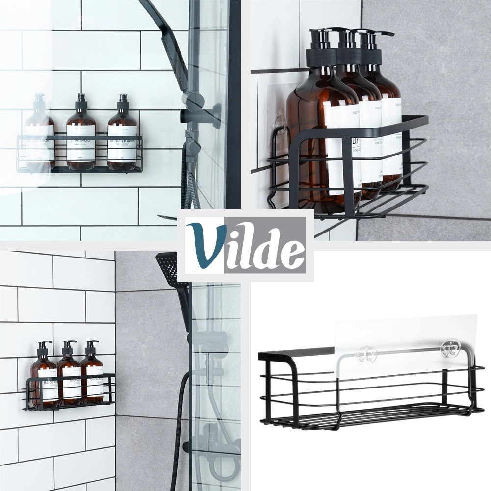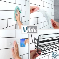 Organisieren Sie Ihr Bad stilvoll und ohne Bohren. Das selbstklebende Regal Vilde im industriellen Loft-Stil haftet fest auf glatten, entfetteten Oberflächen dank der transparenten selbstklebenden Trägerplatte. Die Maße 31 × 12 × 9,5 cm bieten ausreichend Platz für Duschgels, Shampoos und Schwämme, während das erhöhte Geländer das Herunterfallen von Gegenständen verhindert.