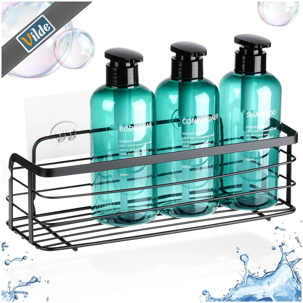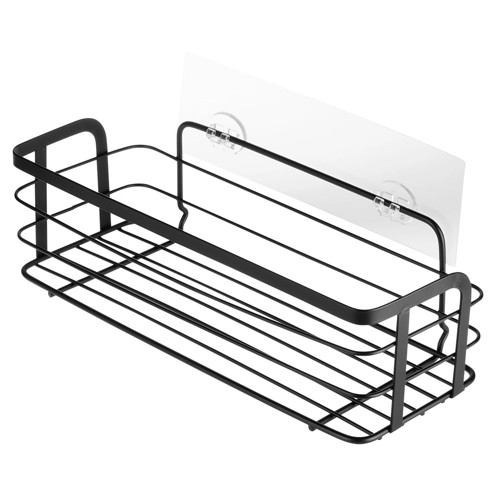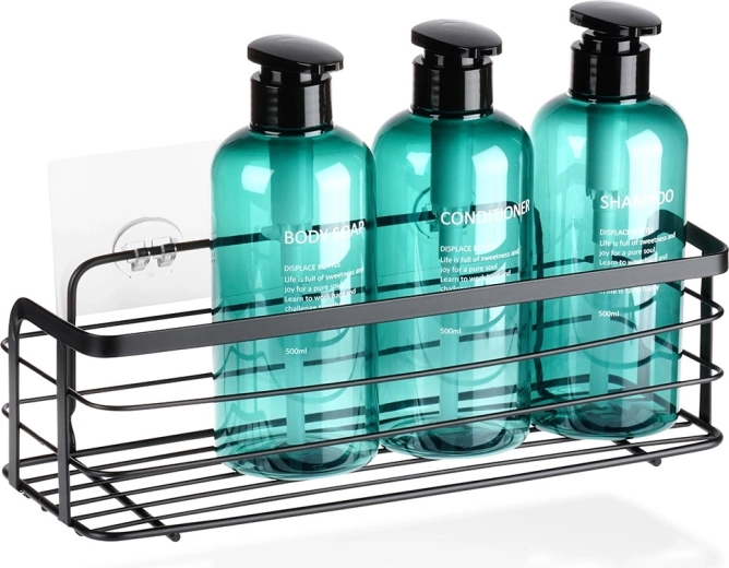 Praktisches selbstklebendes Duschregal in elegantem Schwarz hält Ihre Kosmetik übersichtlich griffbereit. Dank der bohrfreien, selbstklebenden Montage lässt es sich einfach auf glatten Fliesen befestigen. Die offene Drahtkonstruktion sorgt für schnellen Wasserablauf und der robuste, pulverbeschichtete Stahl ist leicht zu reinigen und rostfrei. Ideal für die Dusche, neben der Badewanne oder am Waschbecken – alternativ auch in der Küche für Gewürze.