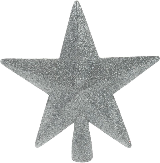 Elegante Baumspitze in Form eines glitzernden silbernen Sterns in der Größe 19 × 19,5 cm verleiht Ihrem Baum festlichen Glanz. Aus robustem, unzerbrechlichem Kunststoff gefertigt, ist sie sicher für Haushalte mit Kindern und Haustieren und lässt sich dank des praktischen Abschlusses einfach und stabil auf die Baumspitze setzen.
