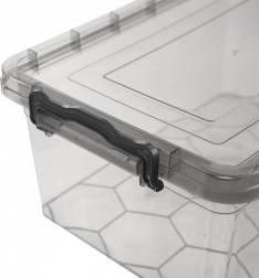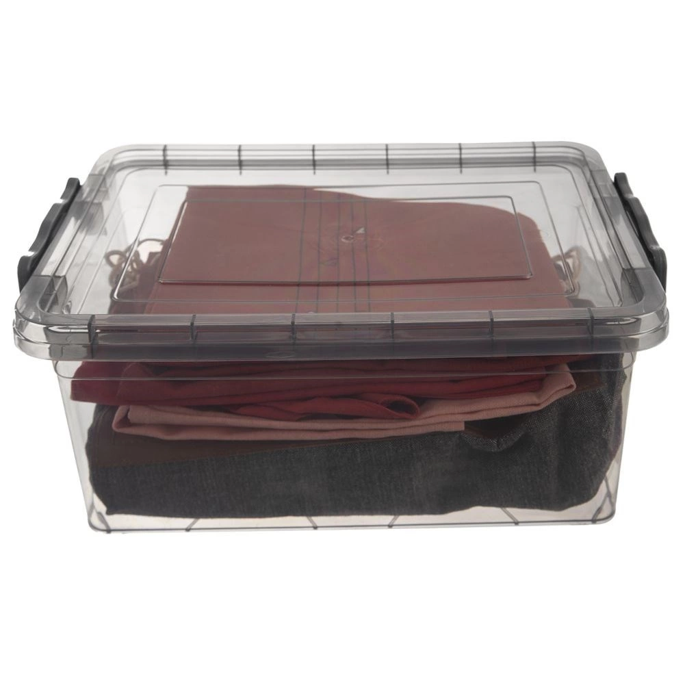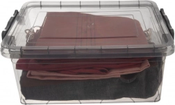 Universeller Kunststoffbox mit 14 l Volumen und sicherem Clip-Deckel, ideal zur Aufbewahrung von Lebensmitteln, Kleidung und Kleinteilen. Dank der transparenten, dunkelgrauen Ausführung sehen Sie den Inhalt ohne Öffnen. Das Material ist BPA-frei, temperaturbeständig von -25 °C bis +95 °C, spülmaschinengeeignet, mikrowellengeeignet (ohne Deckel), für Kühlschrank und Gefrierfach geeignet. Das verschließbare Deckel mit zwei Clips schützt den Inhalt vor Feuchtigkeit und Staub und ermöglicht einen sicheren Transport.