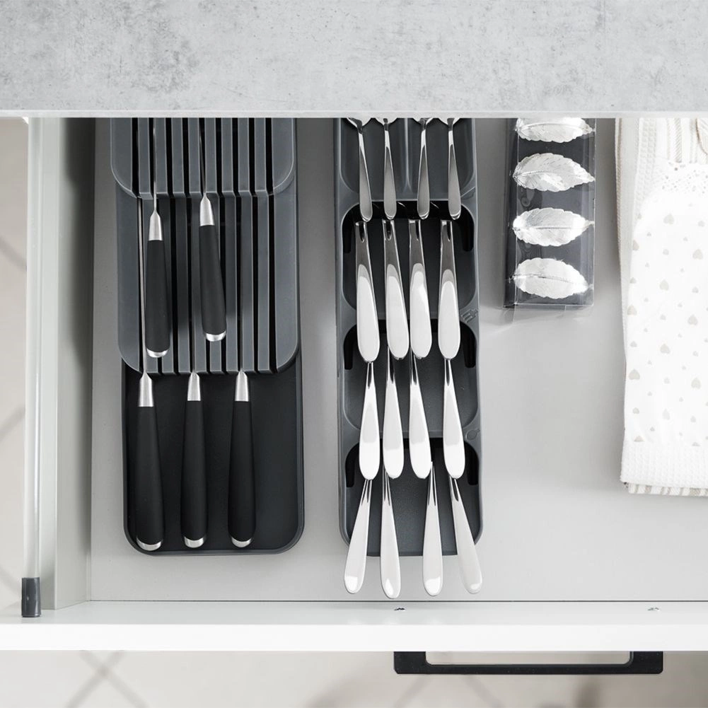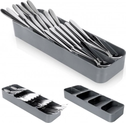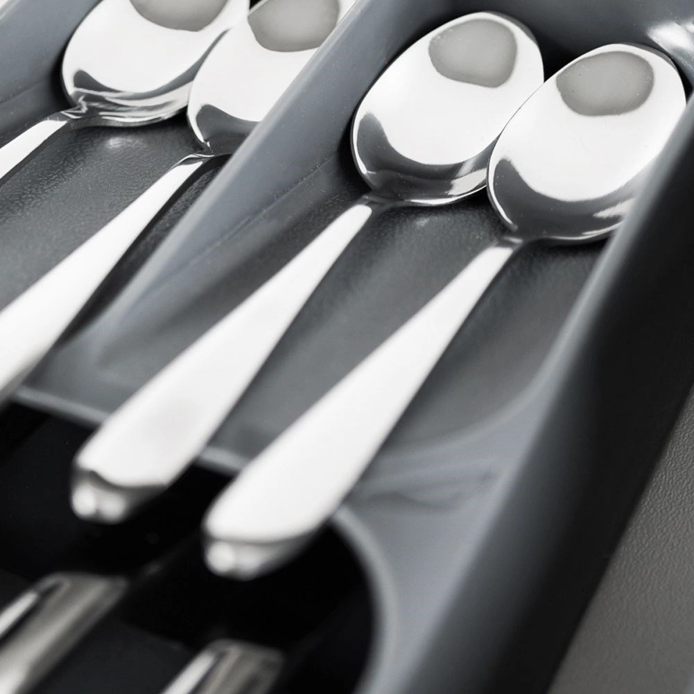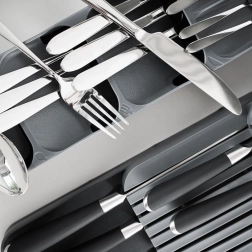 Die langlebige Ausführung aus hochwertigem Kunststoff in elegantem Grau gewährleistet einfache Reinigung und eine lange Lebensdauer. Der Organizer ist ideal zur Aufbewahrung von Löffeln, Gabeln, Messern sowie kleinen Löffeln und Gabeln – jedes Teil hat seinen festen Platz.