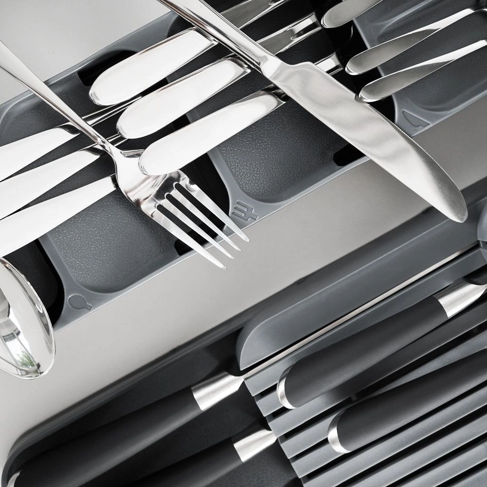 Die clevere, gestufte Anordnung hält Löffel, Gabeln und Messer getrennt, leicht zugänglich und spart Platz in der Schublade.
