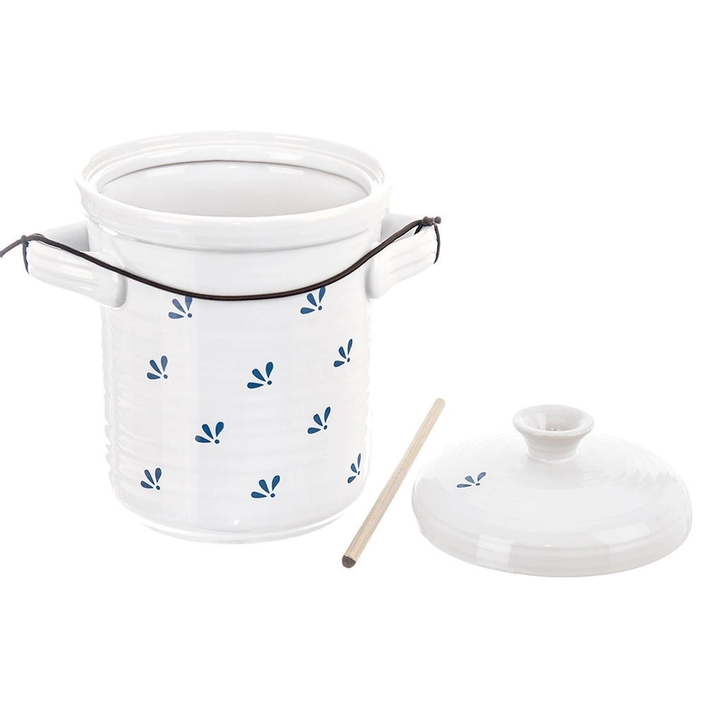 Weiße glasierte Keramik mit blauem Dekor lässt kein Licht durch und hilft, eine konstante Temperatur zu halten – entscheidend für schmackhafte und knackige Fermentationsergebnisse.