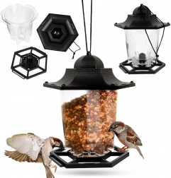 Stilvolles und funktionales Futterhaus für Wildvögel, das sich perfekt in jeden Garten, auf die Terrasse oder den Balkon einfügt. Der transparente Körper ermöglicht eine sofortige Kontrolle des Füllstands, während die breitere Basis den Vögeln bequeme Sitzmöglichkeiten beim Fressen bietet. Das Dach schützt das Futter vor Regen und Schnee, wodurch das Futterhaus ideal für die Winterfütterung und die Sommerbeobachtung gefiederter Besucher ist.