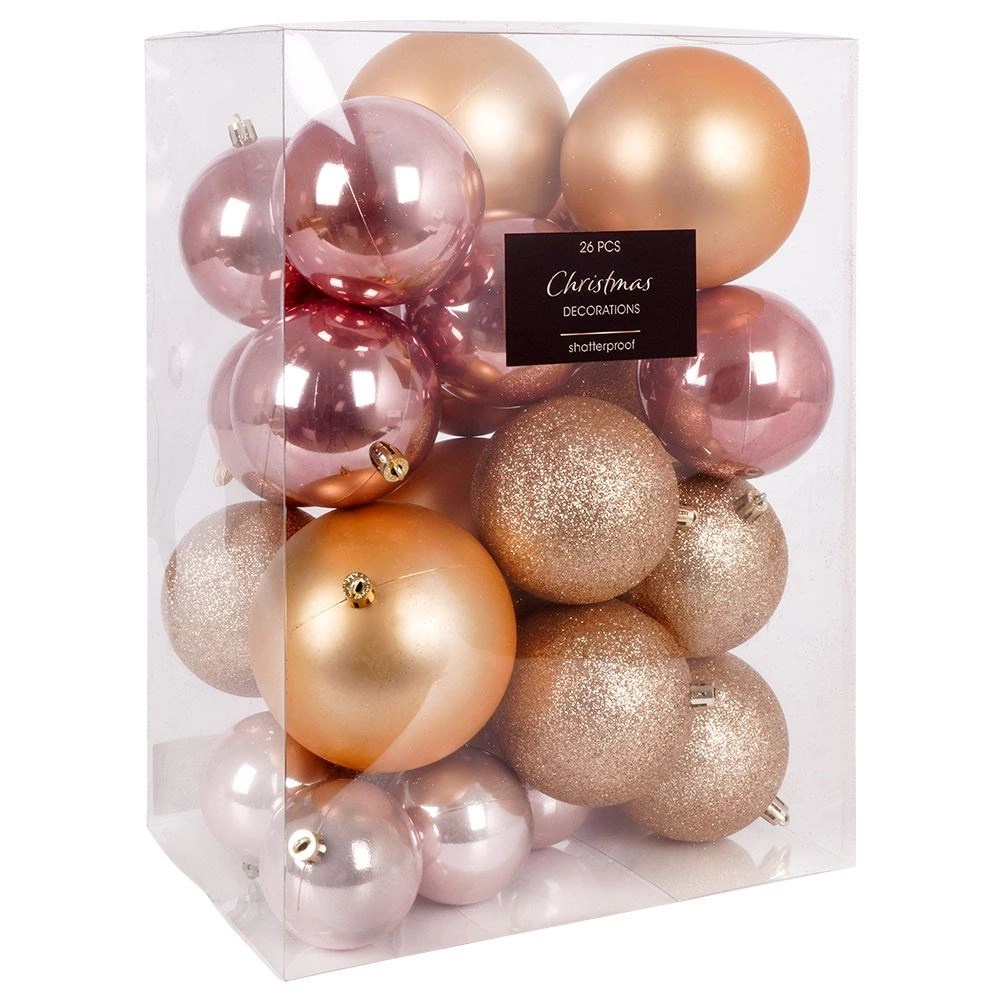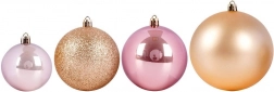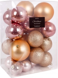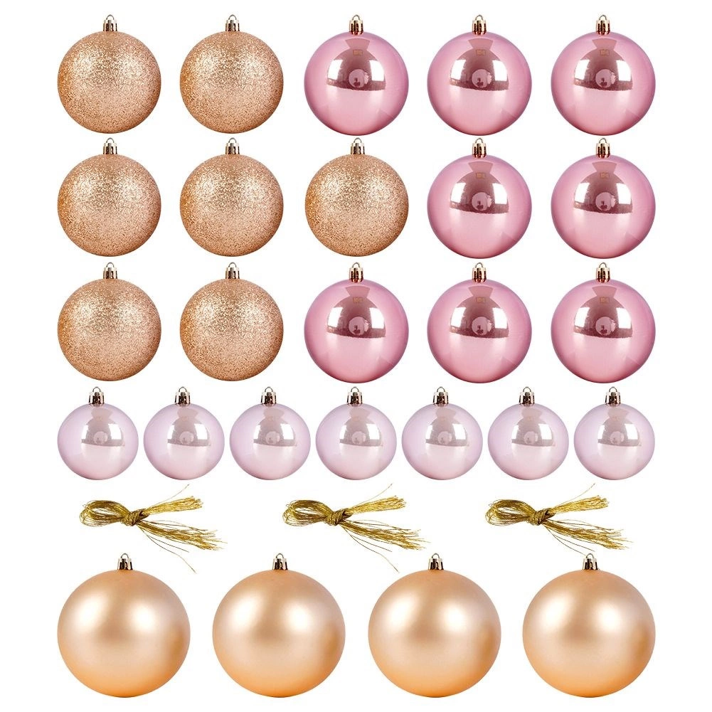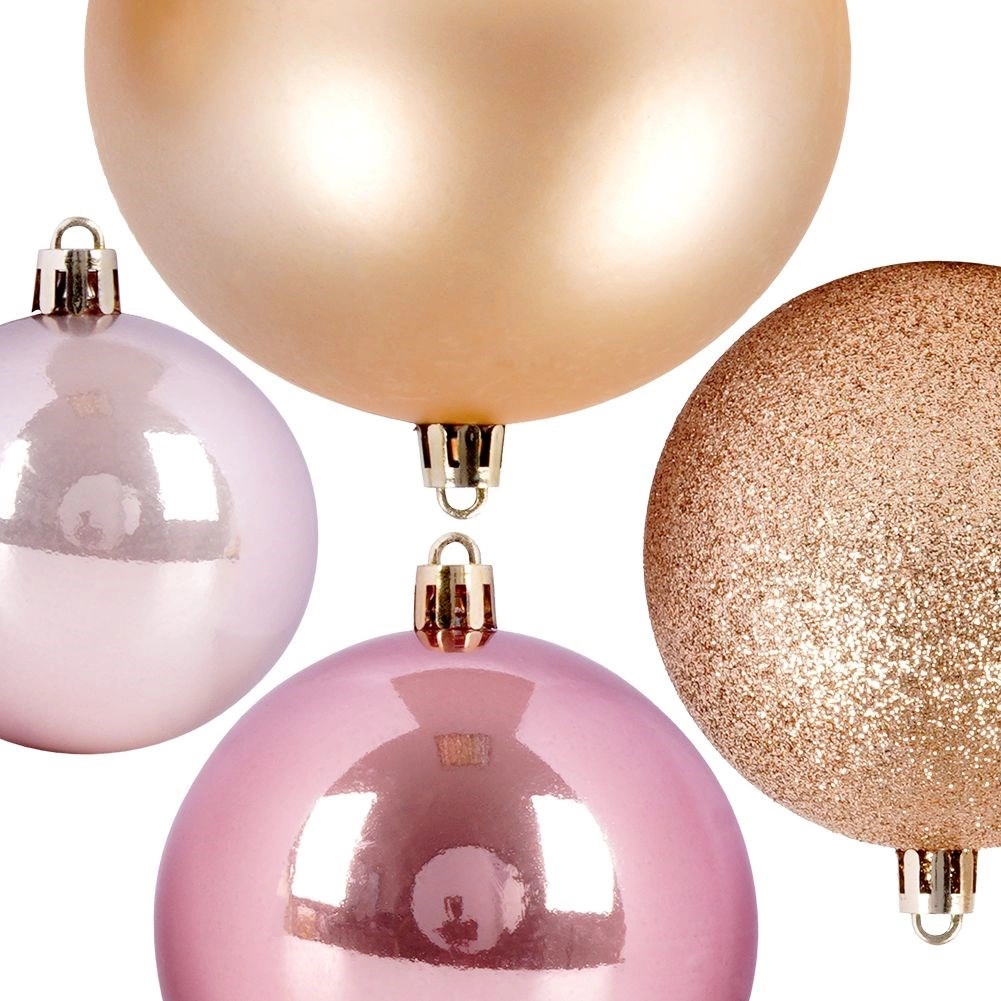 Mit diesem vielseitigen Set in Rosa- und Roségoldtönen gestalten Sie im Handumdrehen eine stilvolle Weihnachtsdekoration. Die verschiedenen Größen 6, 8 und 10 cm sowie der Mix der Oberflächen (matt, glänzend, Glitzer) verleihen dem Baum Tiefe und Funkeln. Die Kugeln sind leicht, robust und dank der Metallösen einfach aufzuhängen.