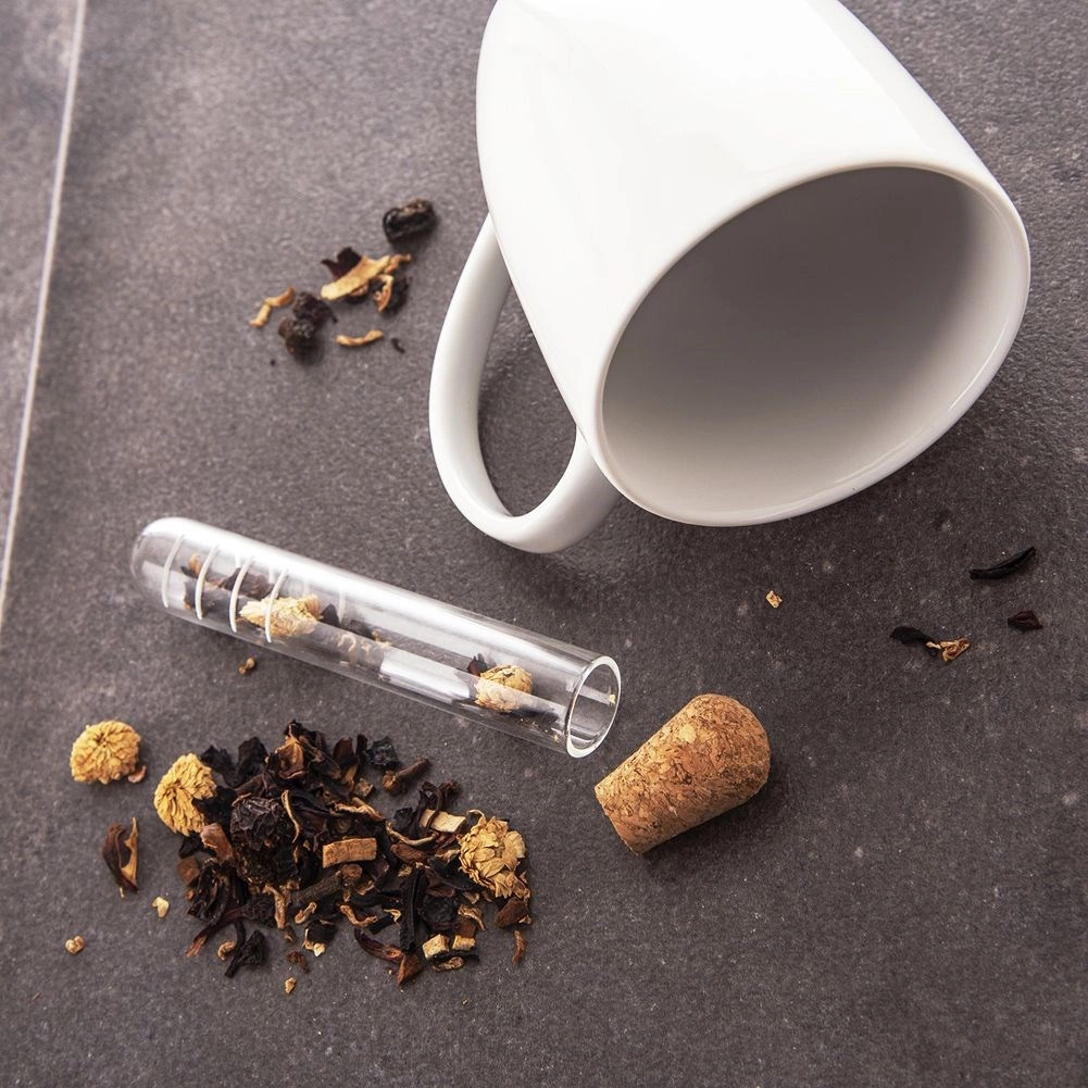 Dieses elegante Glas-Teesieb in Reagenzglasform ermöglicht bequemes Ziehen direkt in Becher, Tasse oder Glas. Die feine Perforation lässt vollen Geschmack und Duft durch, während die Blätter im Inneren verbleiben. Der Korkverschluss ist lang genug, um ein sicheres Herausziehen ohne Verbrennungsrisiko zu gewährleisten.
