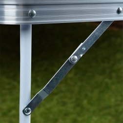 Der Tisch lässt sich schnell auf- und zusammenklappen, die Beine verfügen über Sicherungsstreben und einen eigenen Stauraum unter der Platte. Dank Wasserbeständigkeit und Witterungsbeständigkeit ist er für jedes Wetter bereit.