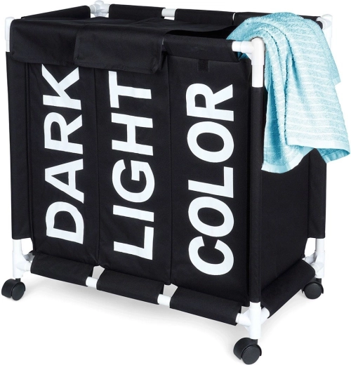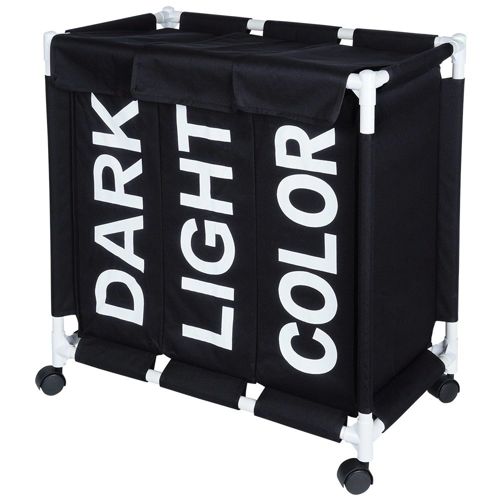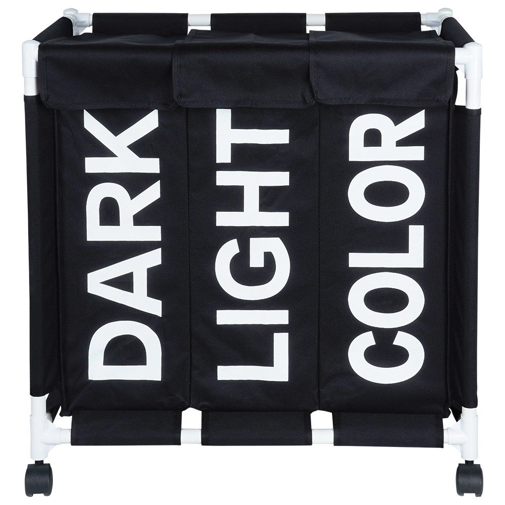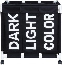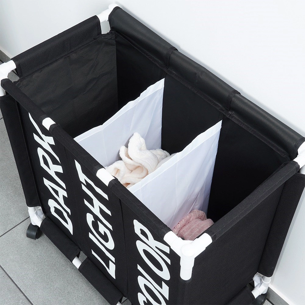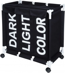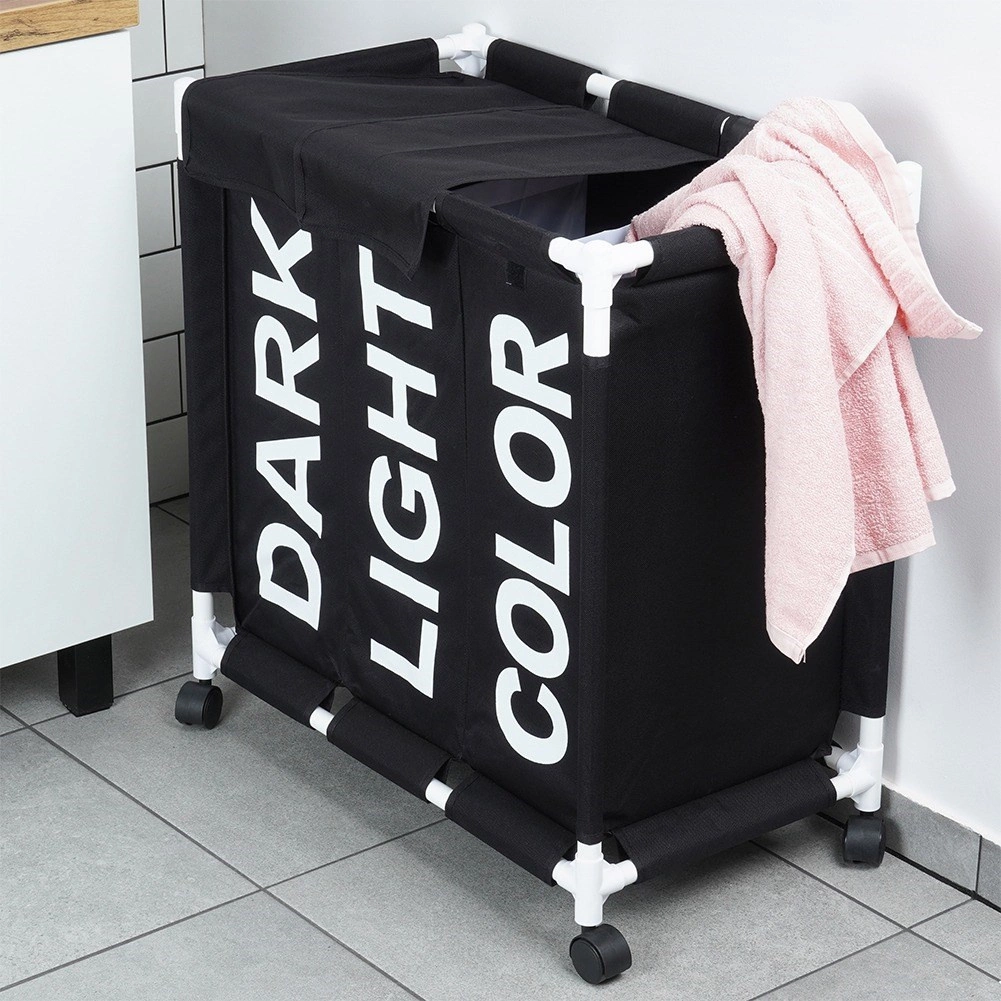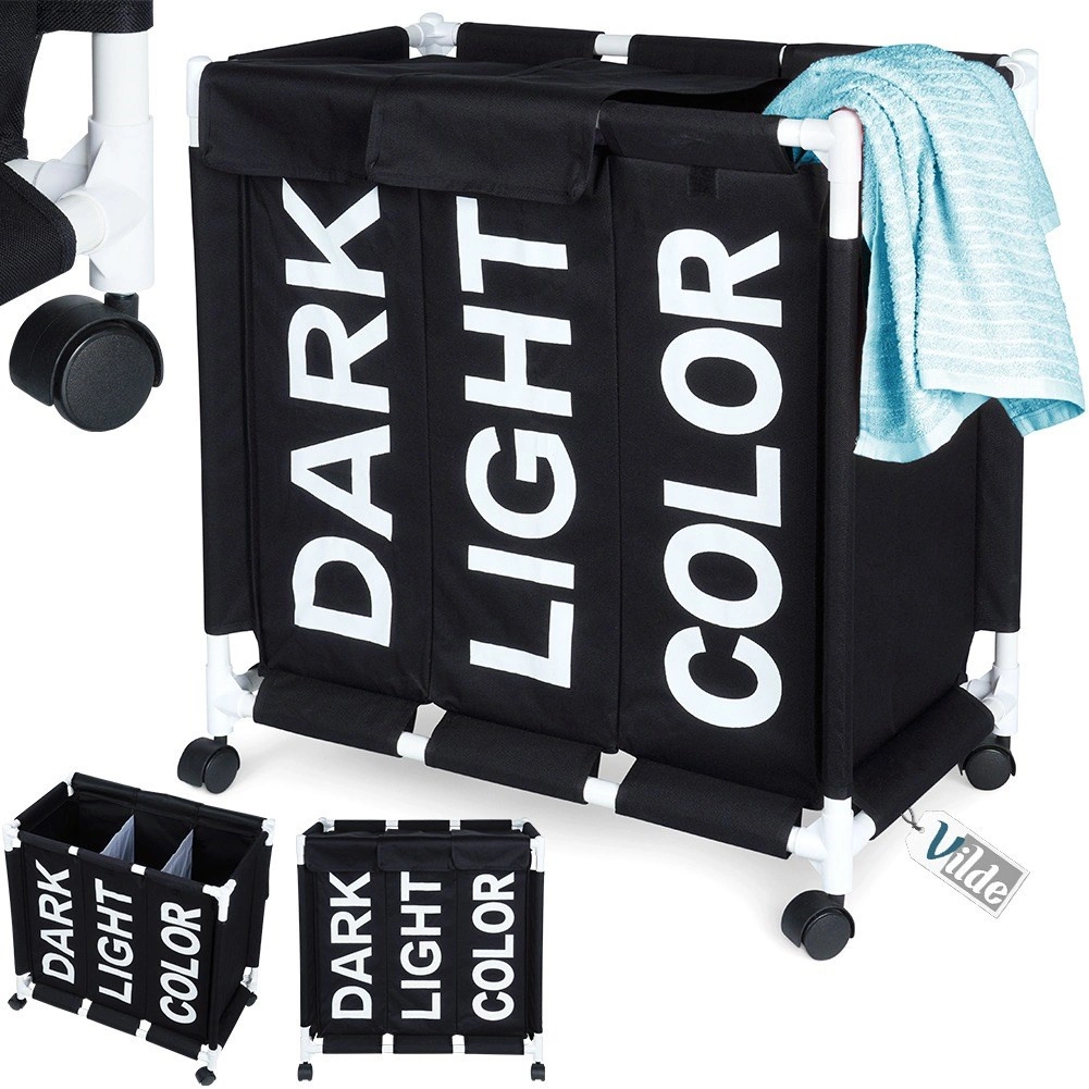 Halten Sie Ihr Zuhause organisiert mit dem durchdachten Wäschekorb mit 137 l Volumen und drei getrennten Kammern. Sichtbare Beschriftungen DARK, LIGHT und COLOR beschleunigen das tägliche Sortieren, während das robuste Gewebe auch bei voller Befüllung die Form behält. Die mobile Konstruktion auf Rollen spart Zeit und schont den Rücken – Wäsche lässt sich leicht direkt zur Waschmaschine transportieren.