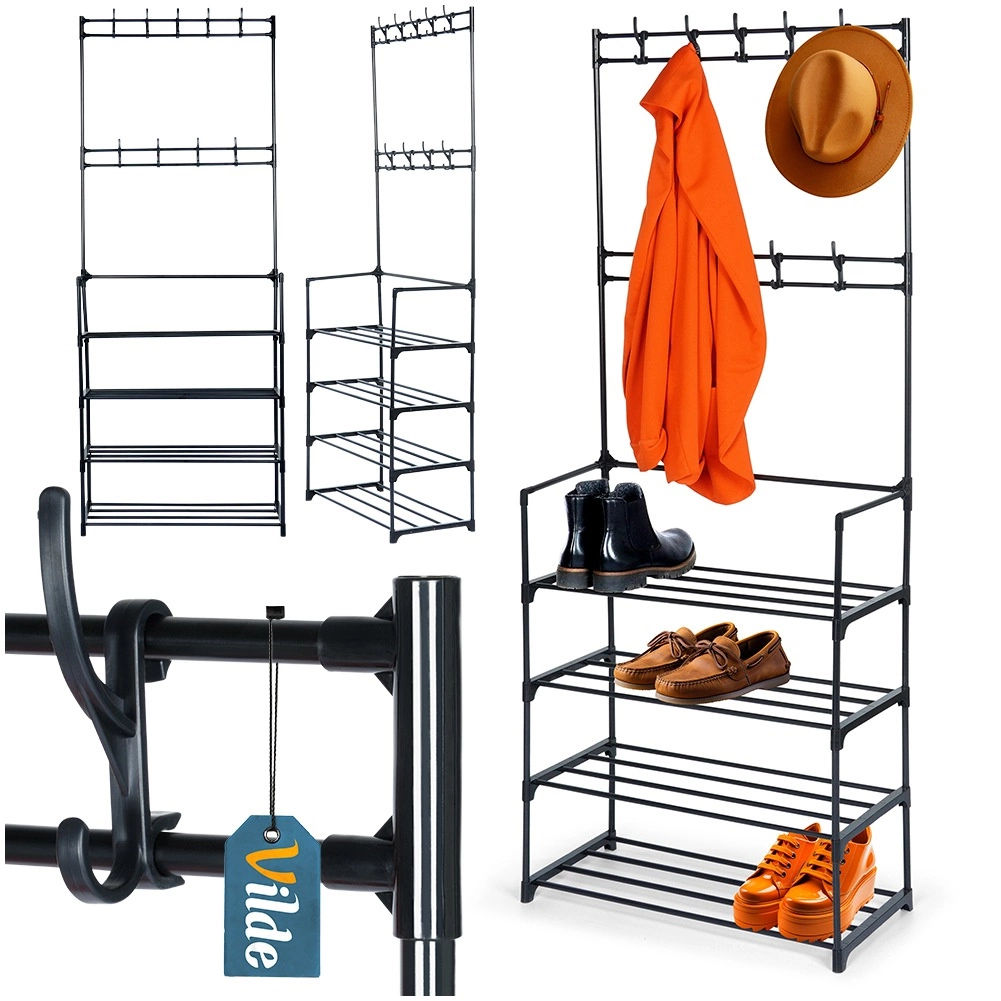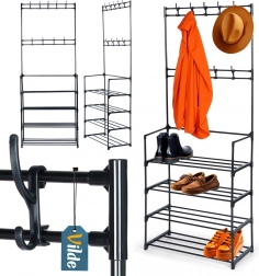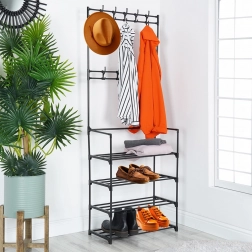Verbessern Sie die Organisation Ihres Eingangsbereichs mit dieser multifunktionalen Garderobe, die Kleiderständer und Schuhregal in einem vereint. Die schlanke Silhouette spart Platz, während die robuste Metallkonstruktion Stabilität und Stil verleiht. Dank 9 Haken lassen sich Mäntel, Handtaschen, Schals und Schlüssel übersichtlich unterbringen.