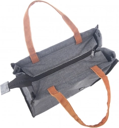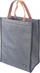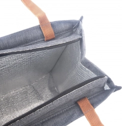 Diese stylische Thermotasche mit 14 Litern Volumen hält dank hochwertiger Thermoisolierung zuverlässig kalte wie warme Speisen. Der robuste graue Polyester ist verschleißfest, die braunen Griffe liegen angenehm in der Hand und der Reißverschluss über die gesamte Länge erleichtert den Zugriff auf den Inhalt. Die praktische rückseitige Reißverschlusstasche fasst Kleinigkeiten, Schlüssel oder Servietten.