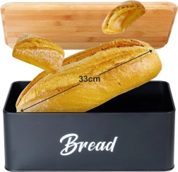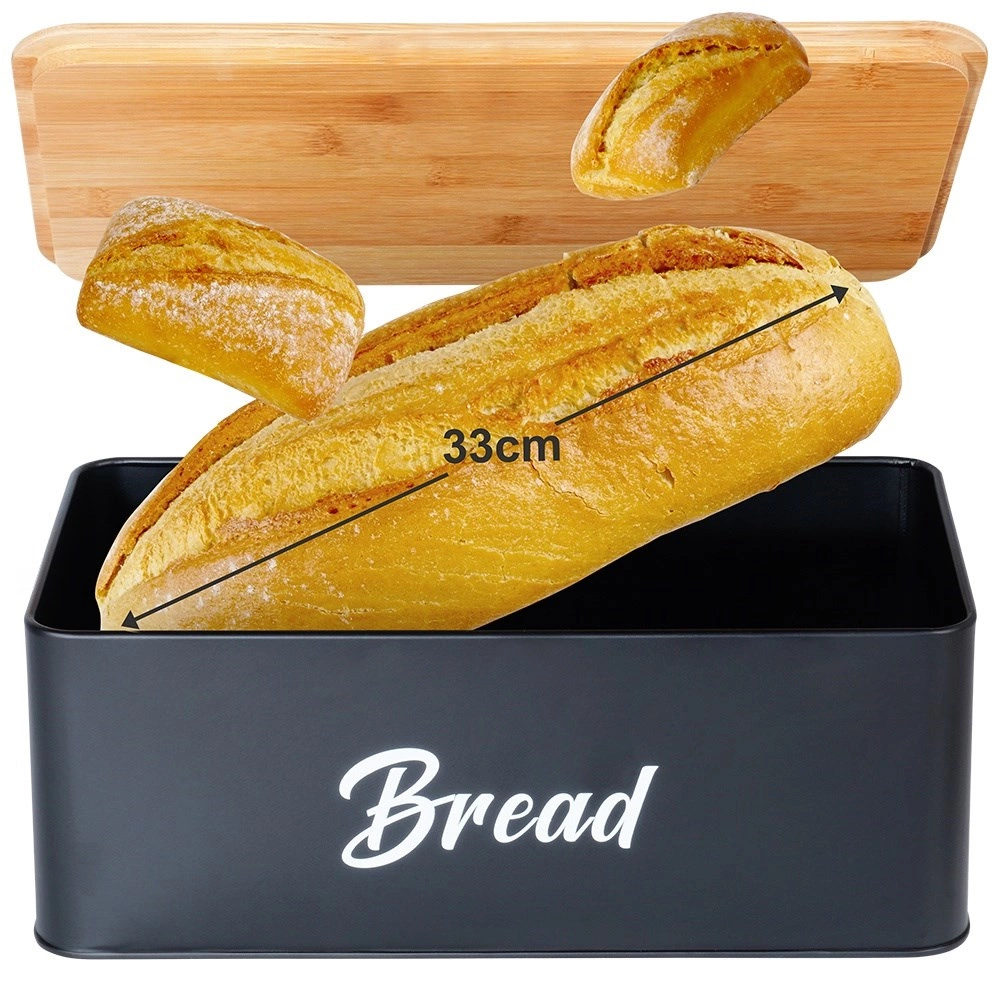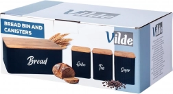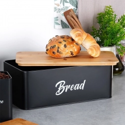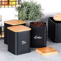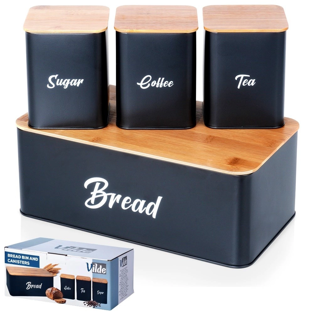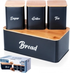 Schwarzer Metall-Brotkasten mit Bambusdeckel und Set aus Dosen für Zucker, Kaffee und Tee, 4-tlg.