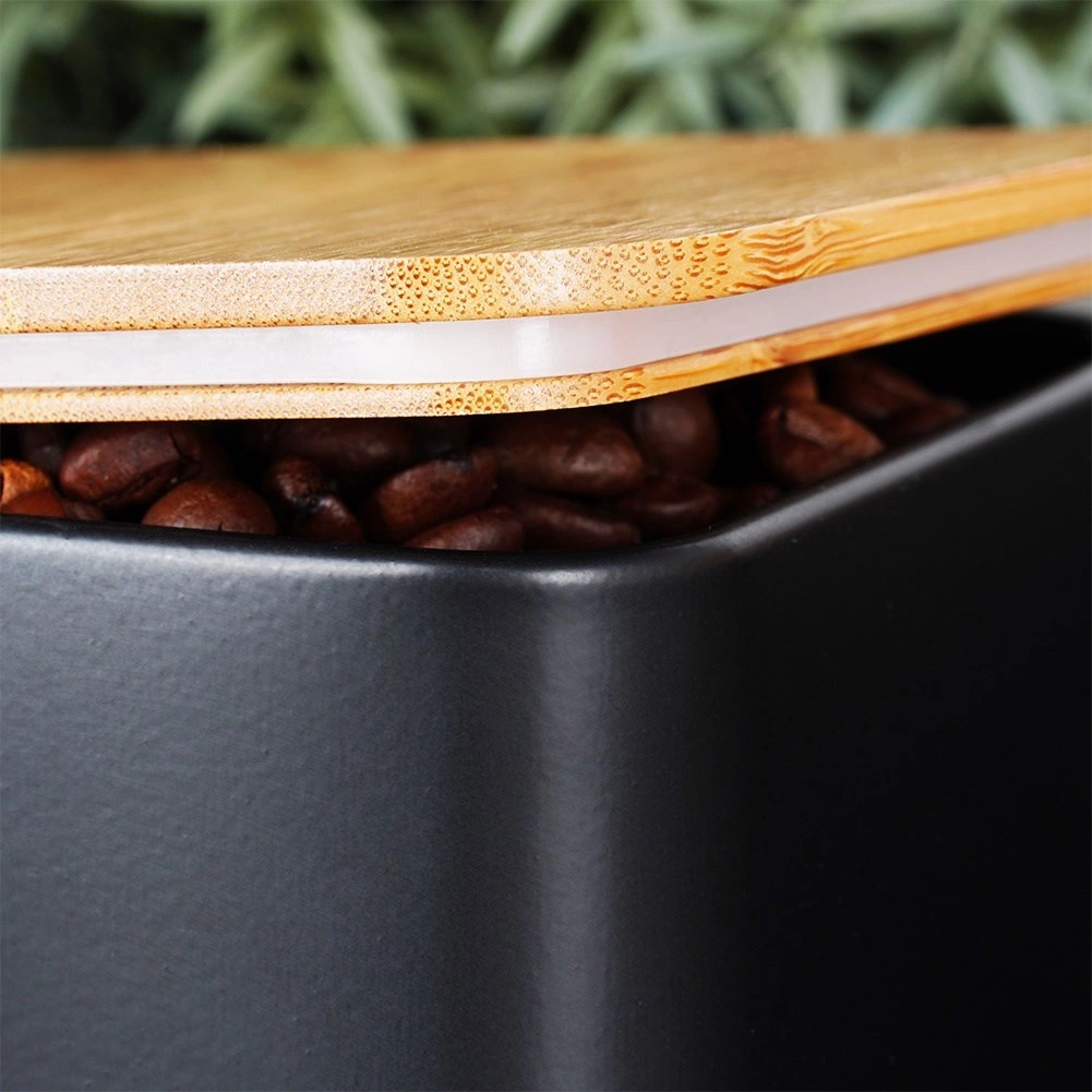 Elegantes Küchen-Set kombiniert einen geräumigen Metall-Brotkasten mit Bambusdeckel und drei luftdichte Dosen für Zucker, Kaffee und Tee. Hält Backwaren länger frisch, hilft bei der Organisation der Arbeitsfläche und passt mit seinem modernen, mattschwarzen Design in Kombination mit Naturholz in jedes Interieur.