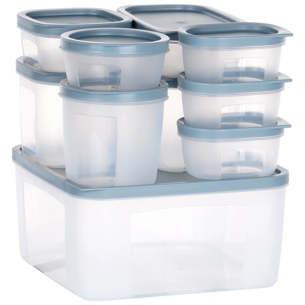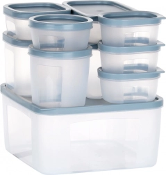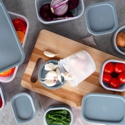 Alle kleineren Dosen können in der größten Box verstaut werden. Die stapelbare Form spart Platz im Kühlschrank, Gefrierfach und in den Schränken.