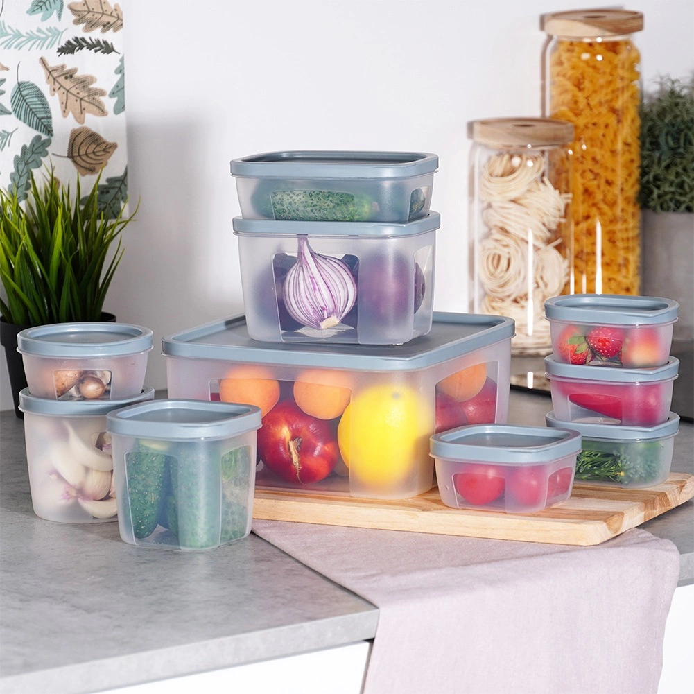 Die Dosen bestehen aus robustem, lebensmittelechtem Kunststoff in transparenter Ausführung mit grauen Deckeln. Ideal für trockene Zutaten, Aufschnitt, Salate, Obst, Gemüse, Fertiggerichte und Snacks sowie für kleines Küchenzubehör. Pflegeleicht – spülmaschinengeeignet, sicher für Gefrierfach und Kühlschrank.