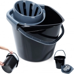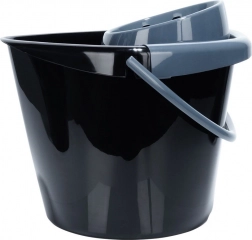 Universeller Eimer mit langlebiger Kunststoffkonstruktion in Schwarz und grauer Presse, der geringes Gewicht mit hoher Widerstandsfähigkeit kombiniert. Dank des ergonomischen Griffs lässt er sich auch bei voller Befüllung bequem tragen und der geformte Ausguss sorgt für kontrolliertes Ausgießen ohne Kleckern.