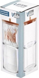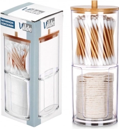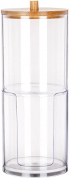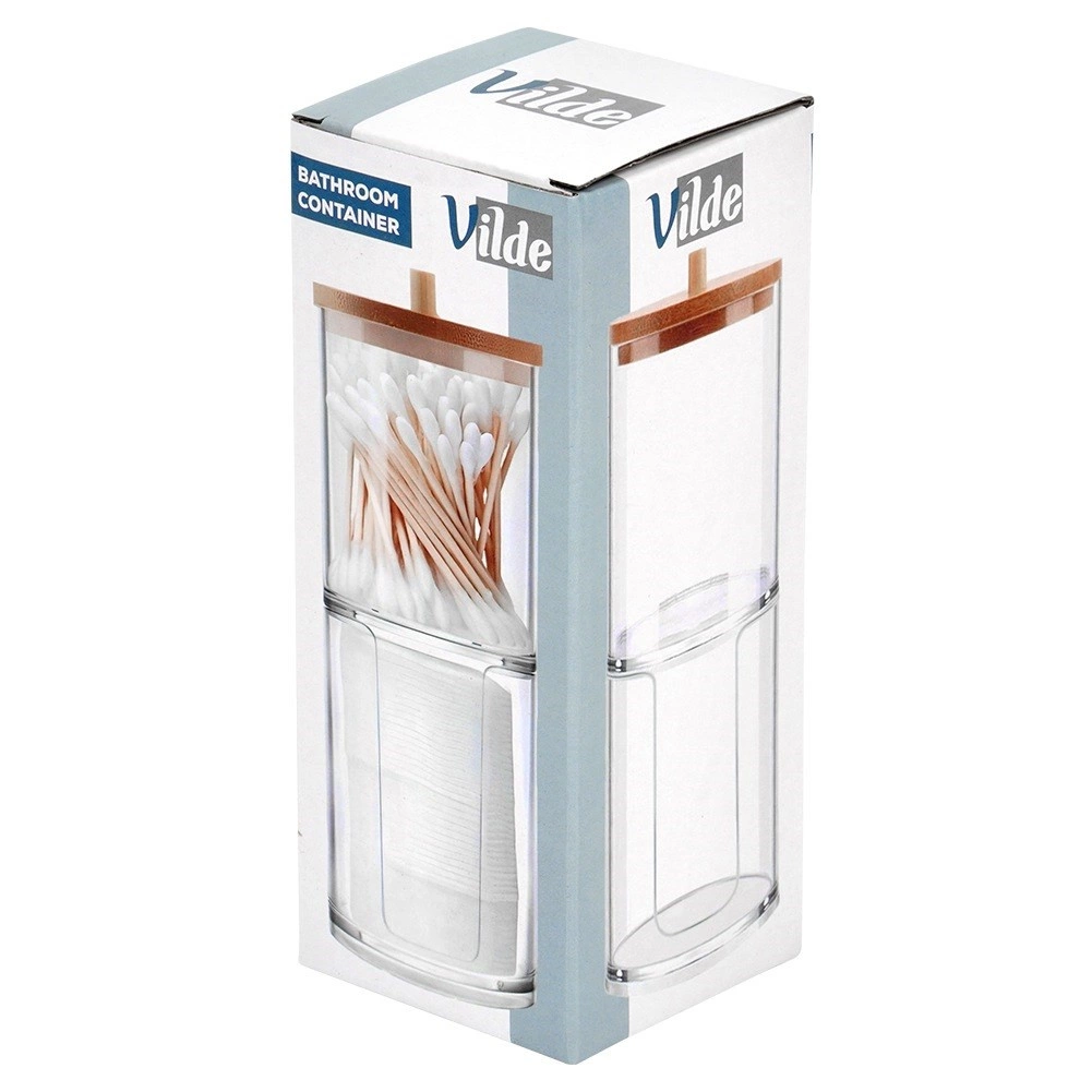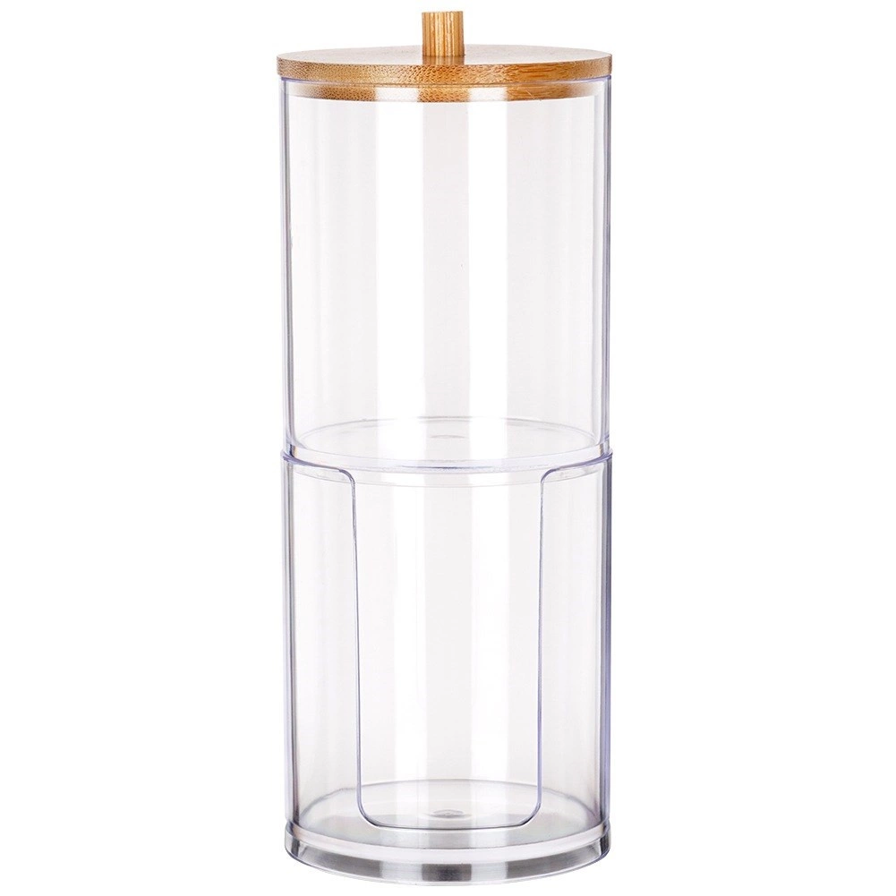 Ein elegantes und funktionales Accessoire für jedes Badezimmer. Zwei getrennte Fächer aus klarem Acryl gewährleisten eine hygienische und übersichtliche Aufbewahrung von Wattestäbchen und runden Pads. Der obere Teil ist mit einem Bambusdeckel mit Griff versehen, der untere Bereich hat einen vorderen Ausschnitt für einfaches Entnehmen.