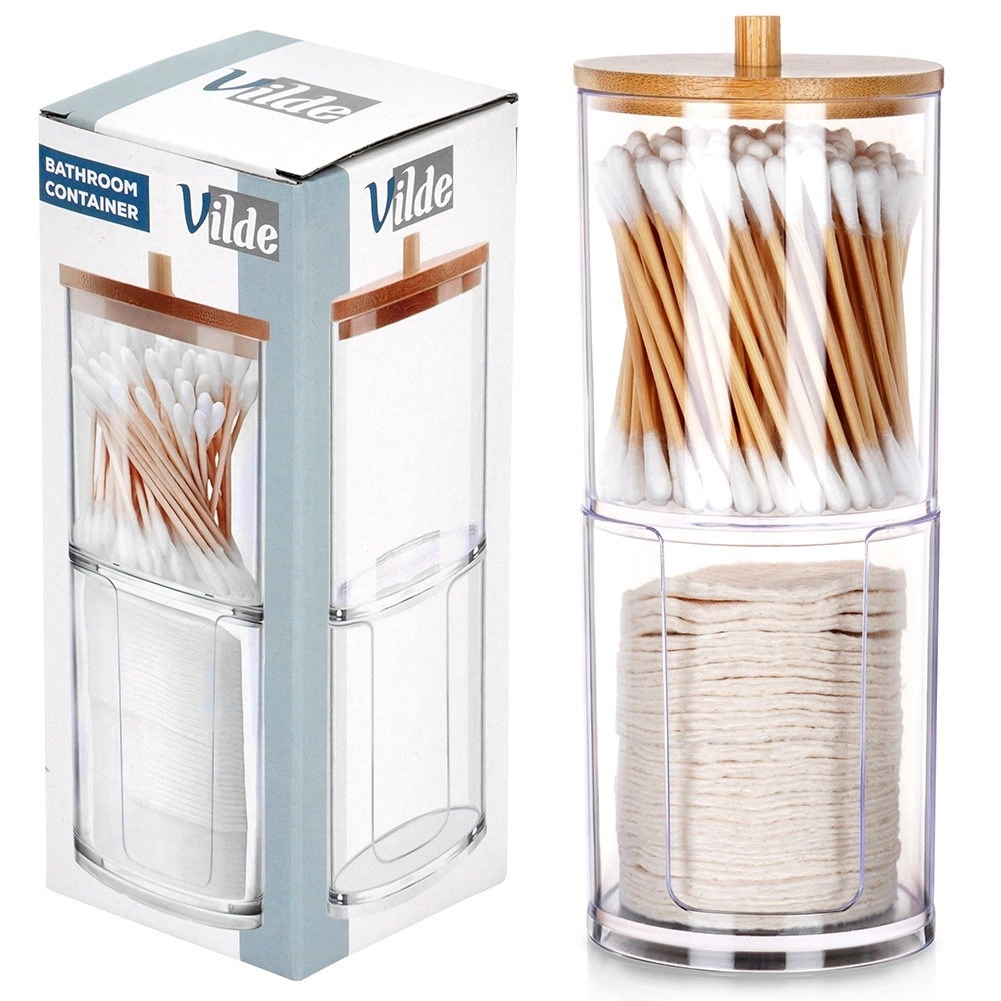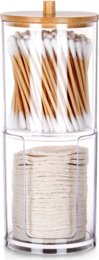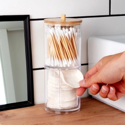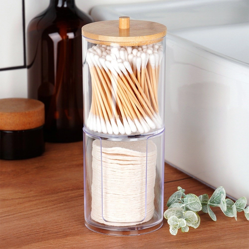 Halten Sie Ihr Badezimmer ordentlich mit diesem zweistöckigen 2-in-1-Organizer für Wattestäbchen und Abschminkpads. Transparenter Acryl sorgt für sofortige Bestandskontrolle, der Bambusdeckel schützt vor Staub und der untere Bereich bietet einen praktischen Pad-Spender für schnelles Entnehmen. Das kompakte, vertikale Design spart Platz auf der Waschbeckenablage.